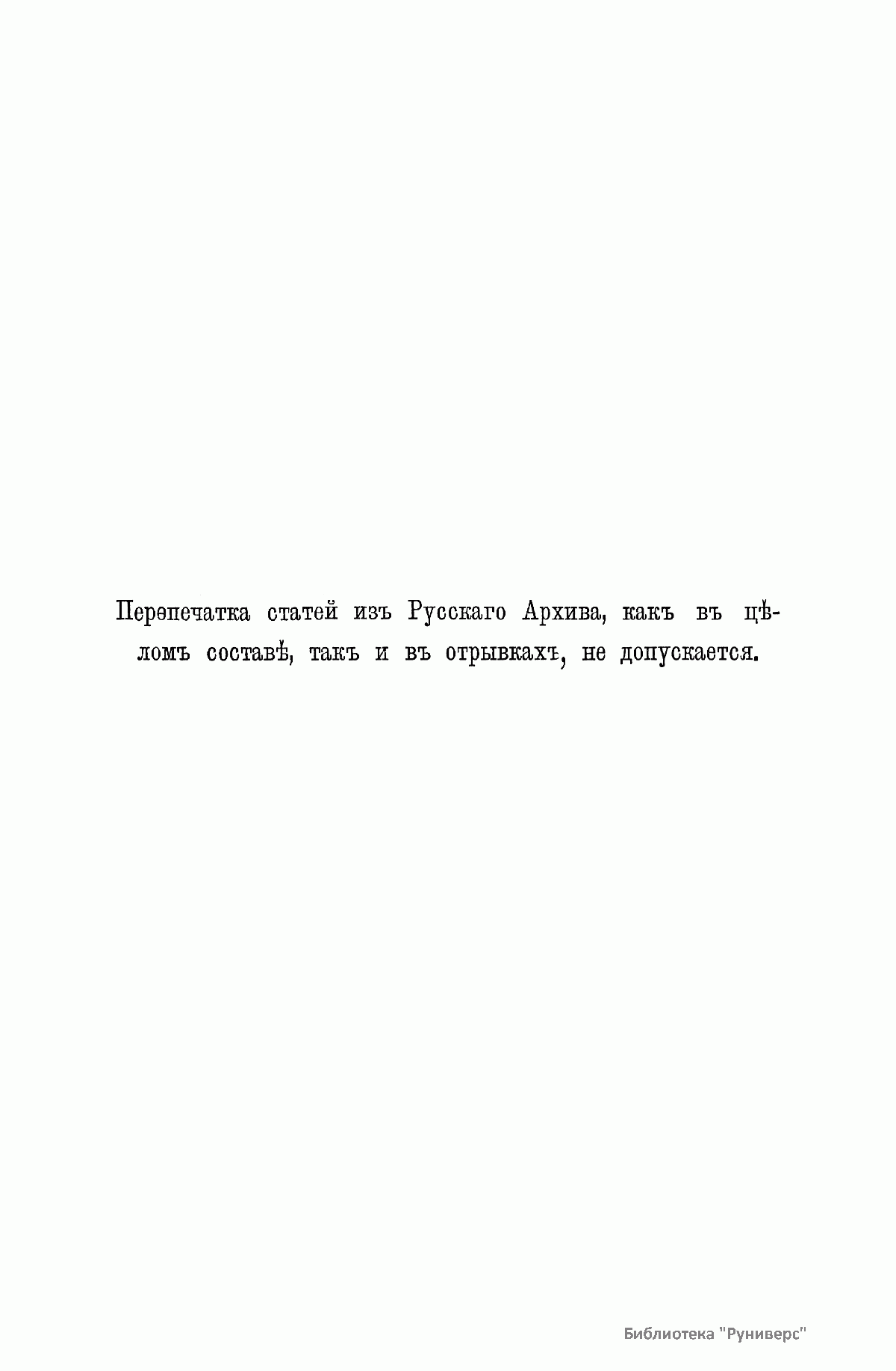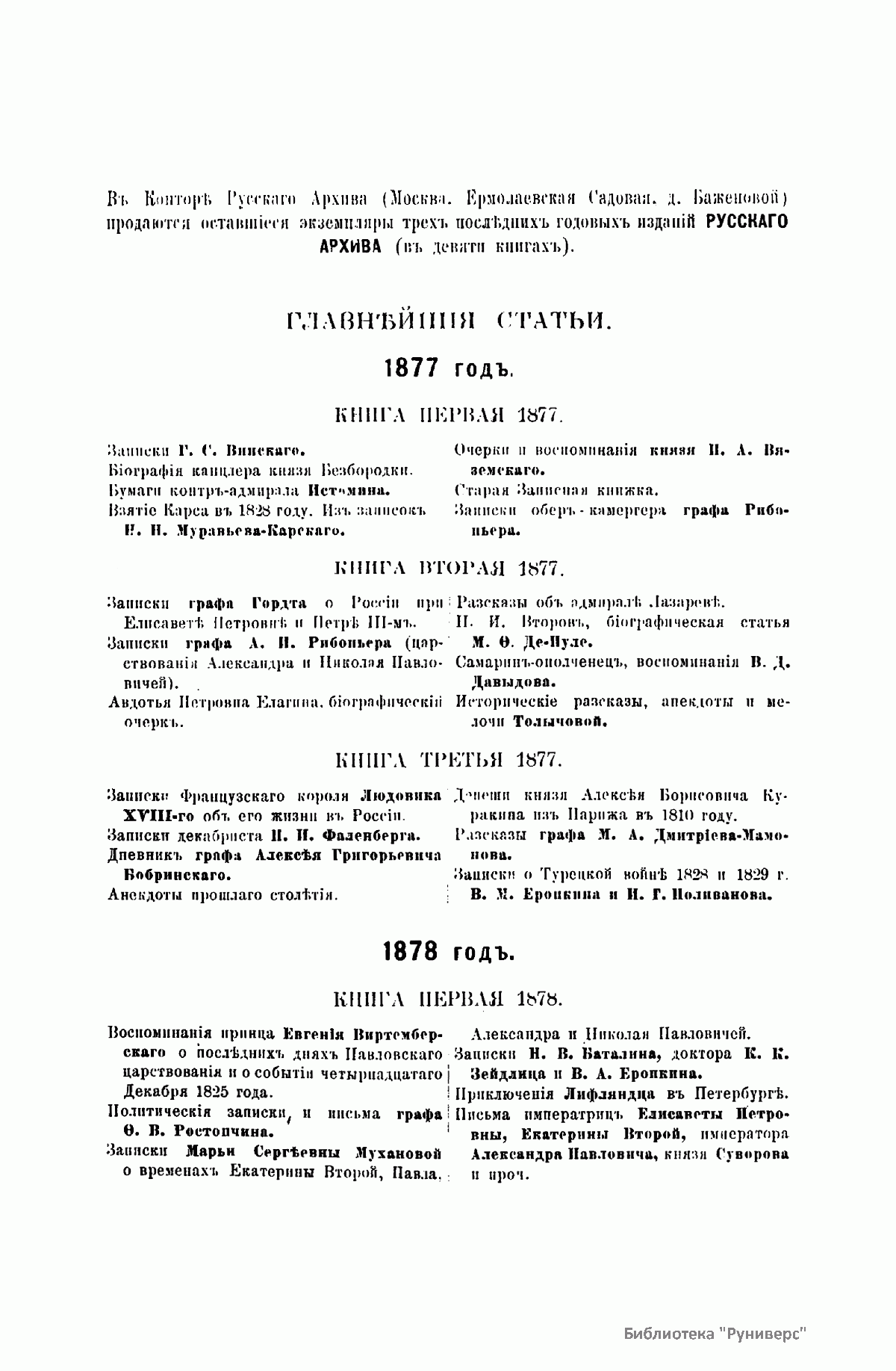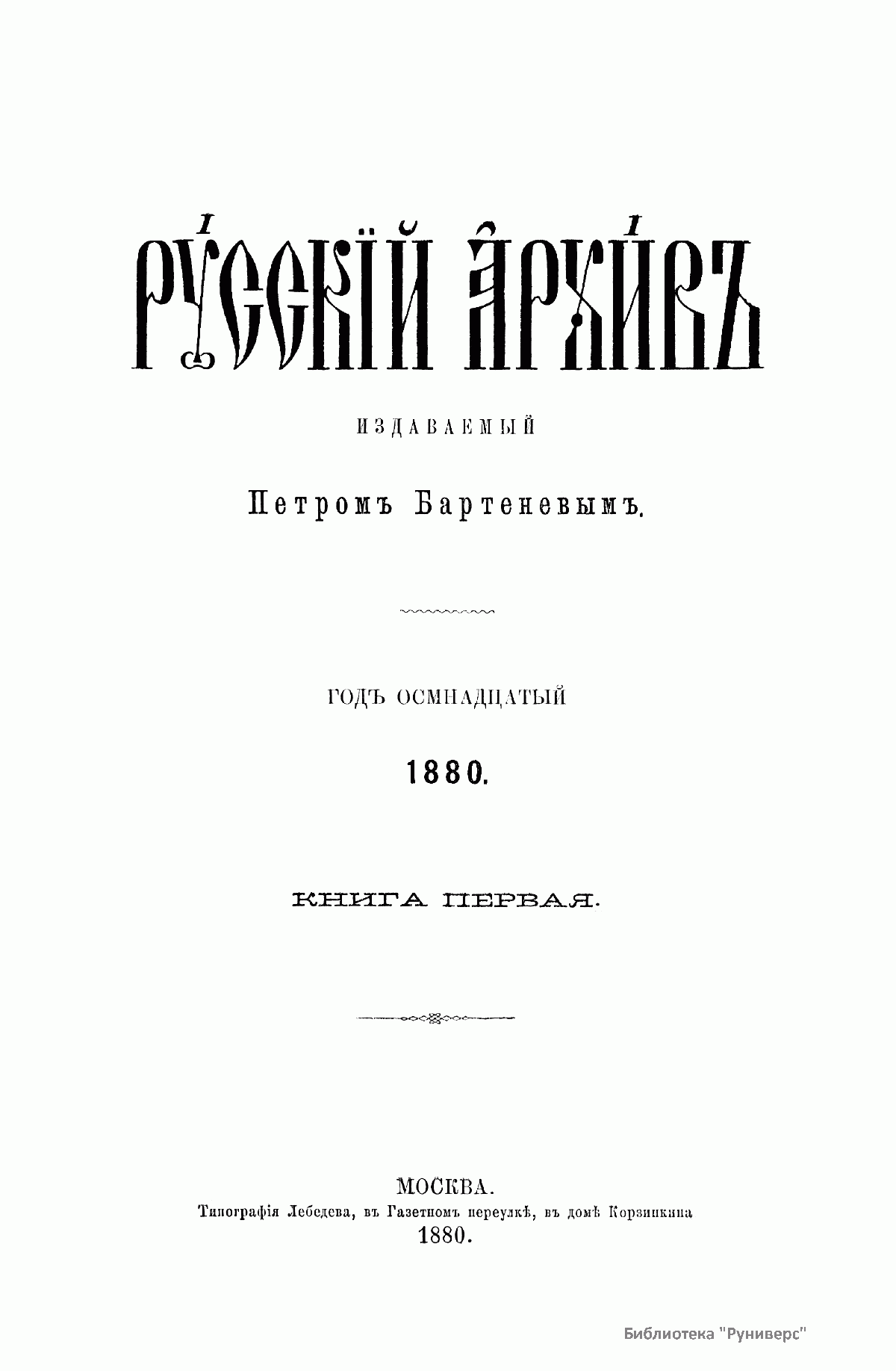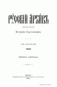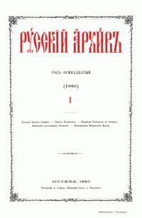 «Русский архив» — ежемесячный историко-литературный журнал, издававшийся в Москве с 1863 по 1917 год. Создателем и продолжительные годы редактором журнала был П. И. Бартенев – историк, археограф, библиограф. Этот журнал называли «живой картиной былого», поскольку он содержал преимущественно публикации неизданных мемуарных, эпистолярных, литературно-художественных и ведомственных документальных материалов, освещавших культурную и политическую историю России в XVIII и XIX вв. По числу опубликованных источников «Русский архив» стоит на первом месте среди русских исторических журналов.