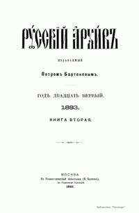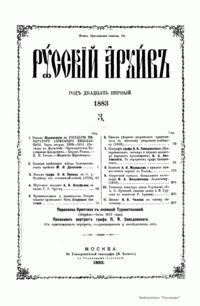 «Русский архив» — ежемесячный историко-литературный журнал, издававшийся в Москве с 1863 по 1917 год. Создателем и продолжительные годы редактором журнала был П. И. Бартенев – историк, археограф, библиограф. Этот журнал называли «живой картиной былого», поскольку он содержал преимущественно публикации неизданных мемуарных, эпистолярных, литературно-художественных и ведомственных документальных материалов, освещавших культурную и политическую историю России в XVIII и XIX вв. По числу опубликованных источников «Русский архив» стоит на первом месте среди русских исторических журналов.