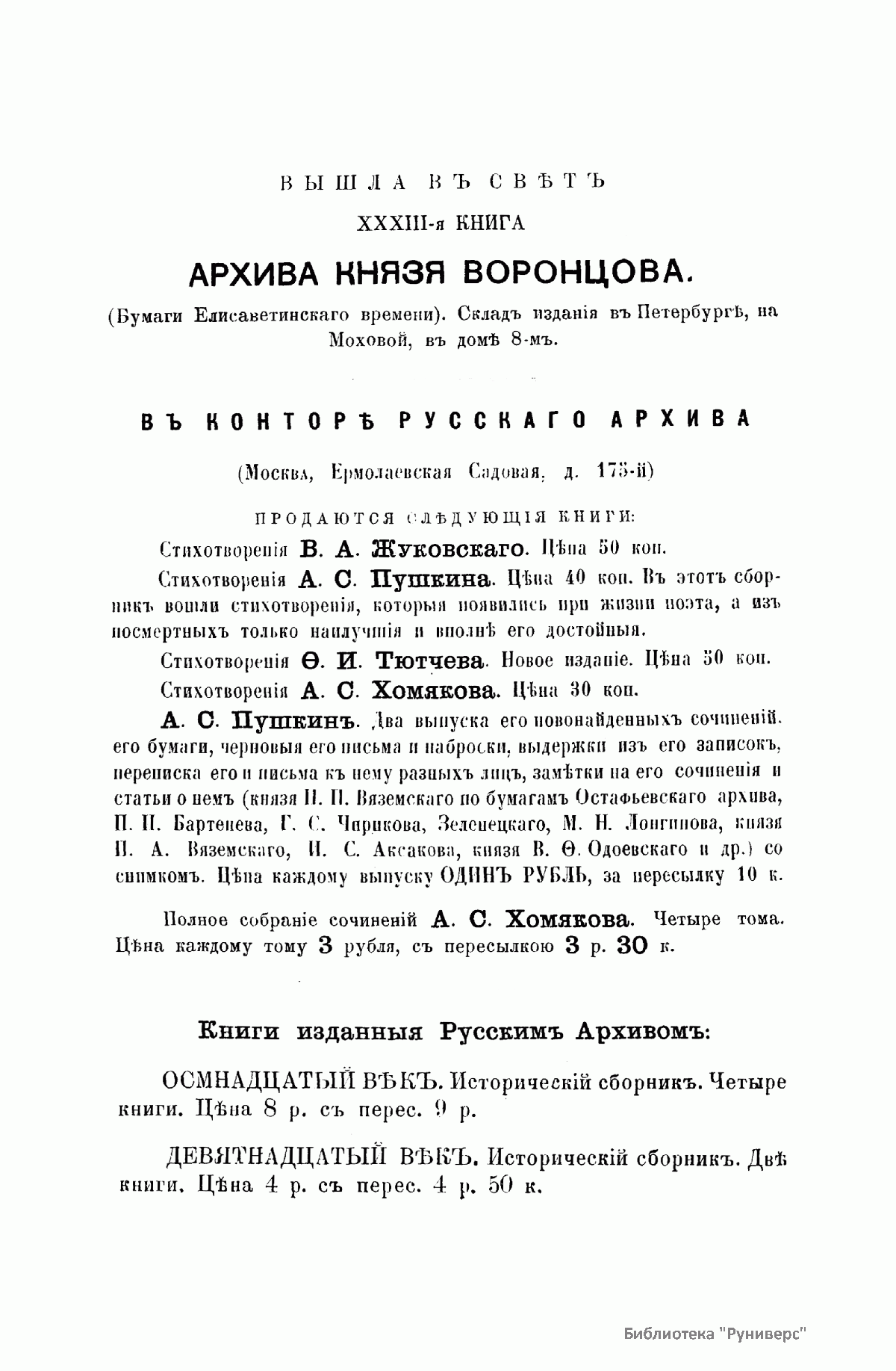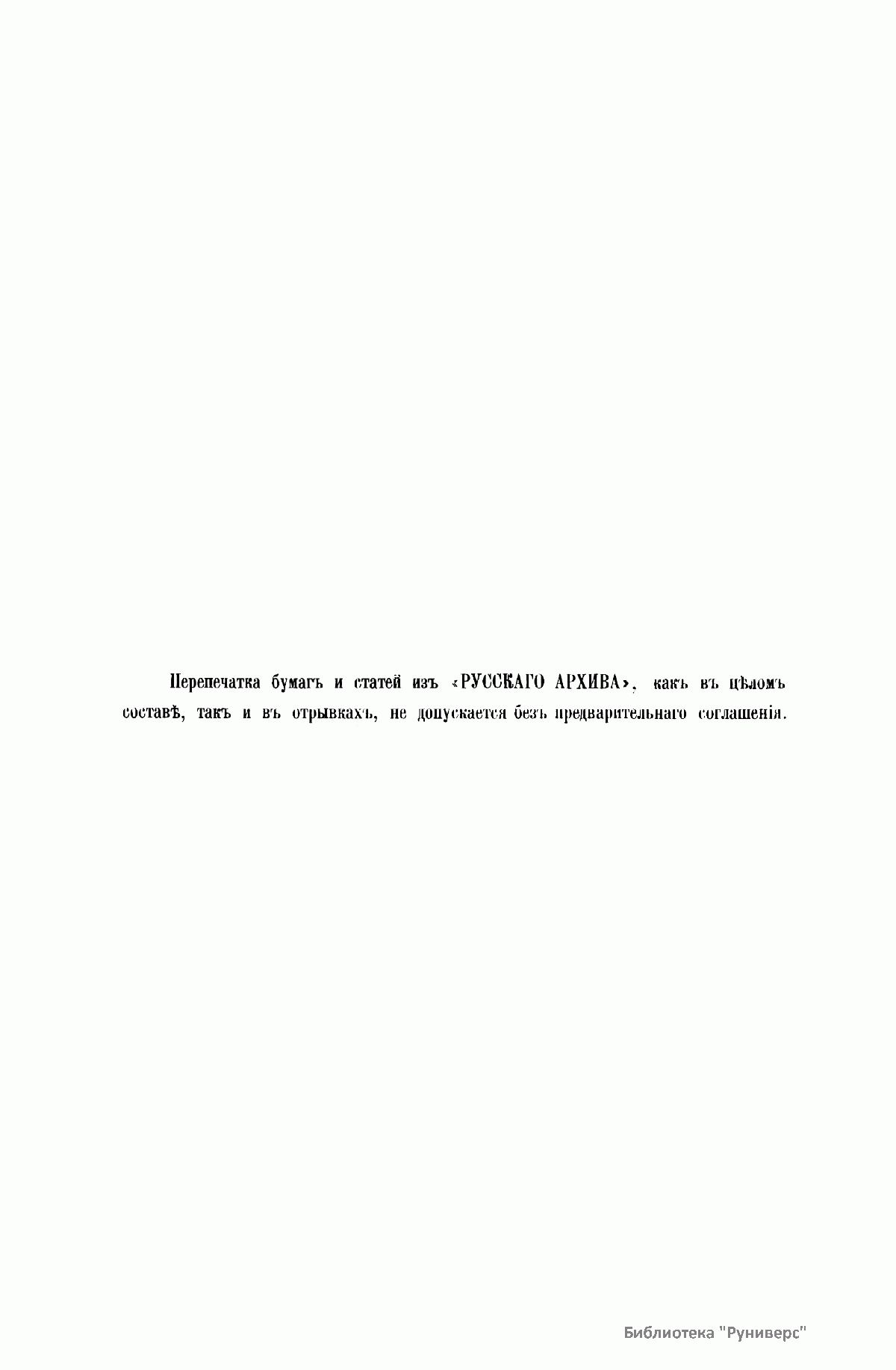 «Русский архив» — ежемесячный историко-литературный журнал, издававшийся в Москве с 1863 по 1917 год. Создателем и продолжительные годы редактором журнала был П. И. Бартенев – историк, археограф, библиограф. Этот журнал называли «живой картиной былого», поскольку он содержал преимущественно публикации неизданных мемуарных, эпистолярных, литературно-художественных и ведомственных документальных материалов, освещавших культурную и политическую историю России в XVIII и XIX вв. По числу опубликованных источников «Русский архив» стоит на первом месте среди русских исторических журналов.