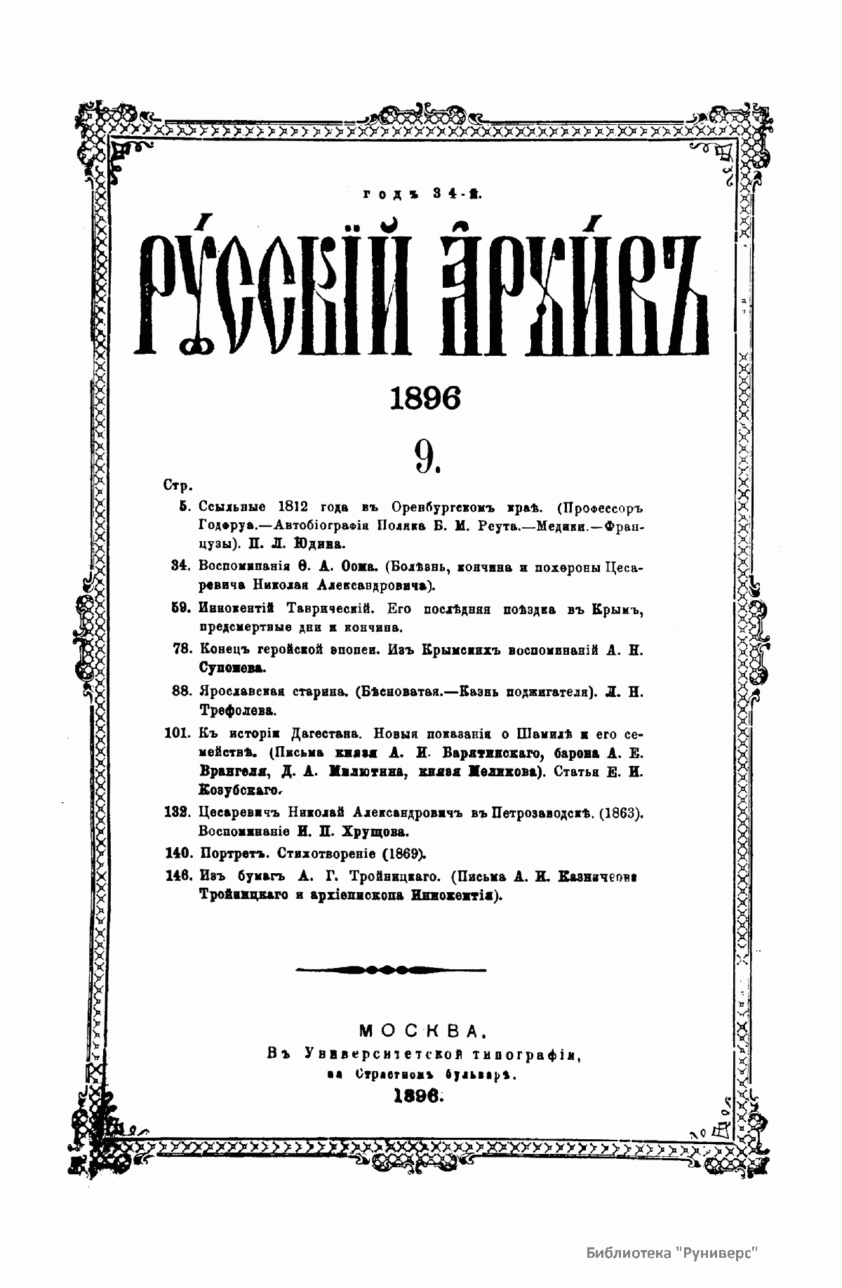 Русскiй архивъ. Историко-литературный сборникъ. 1896. Выпуски 9-12