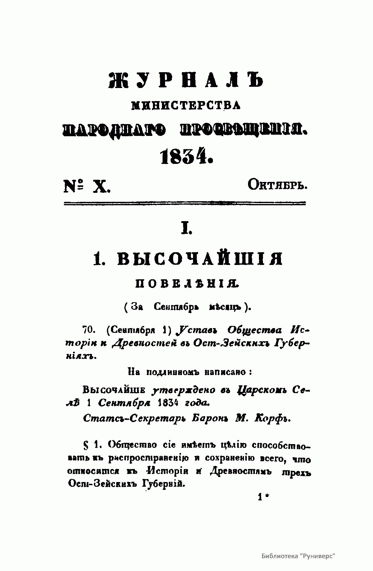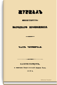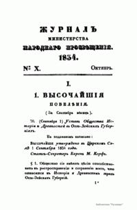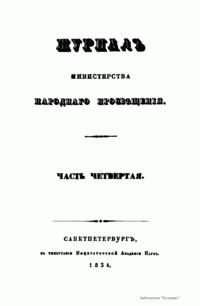 Журнал Министерства народного просвещения выходил с 1834-го по 1917 год. Официальный периодический журнал об успехах просвещения в России. Издатели журнала уверены в том, что «если для каждого человека необходим выход из грубой тьмы невежества и беспрерывное дальнейшее движение к свету, то для народов необходимо попечительное участие правительства в образовании. Только правительство имеет все средства знать и высоту успехов всемирного образования, и настоящие нужды Отечества».