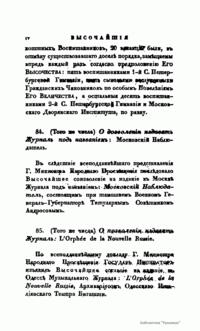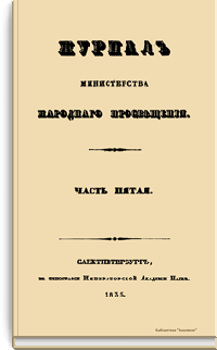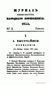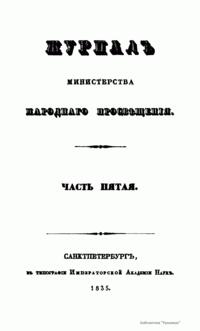 Журнал Министерства народного просвещения выходил с 1834-го по 1917 год. Официальный периодический журнал об успехах просвещения в России. Издатели журнала уверены в том, что «если для каждого человека необходим выход из грубой тьмы невежества и беспрерывное дальнейшее движение к свету, то для народов необходимо попечительное участие правительства в образовании. Только правительство имеет все средства знать и высоту успехов всемирного образования, и настоящие нужды Отечества».