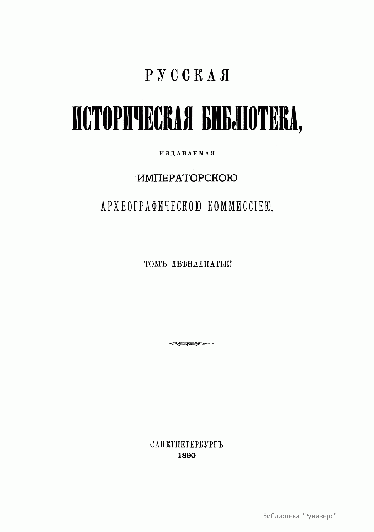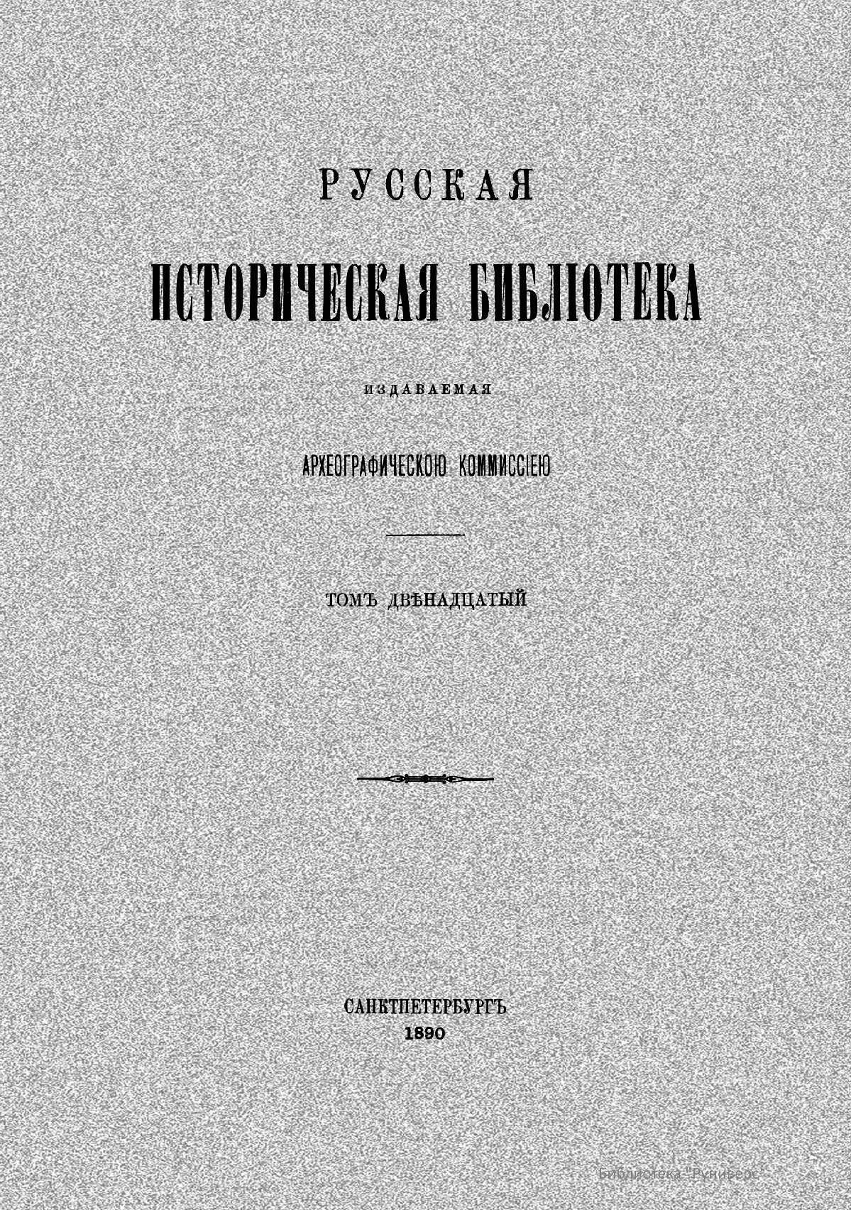 Русская историческая библiотека, издаваемая Археографическою комиссiею. Томъ двѣнадцатый