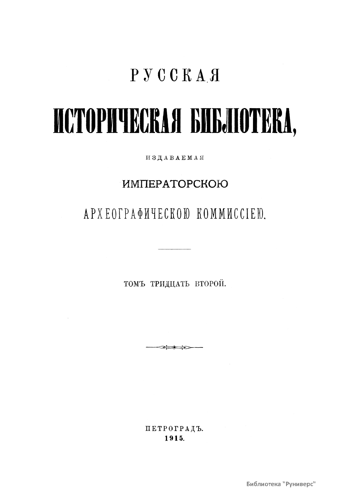 Русская историческая библiотека, издаваемая Археографическою комиссiею. Томъ тридцать второй