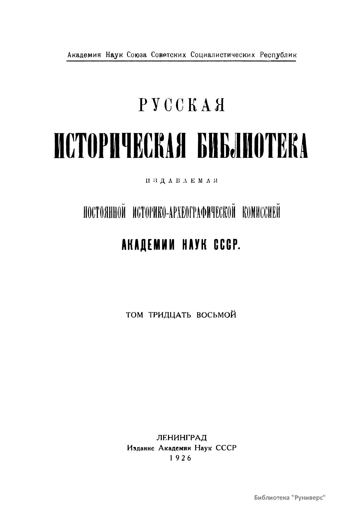 Русская историческая библиотека, издаваемая Археографической комиссией. Том тридцать восьмой