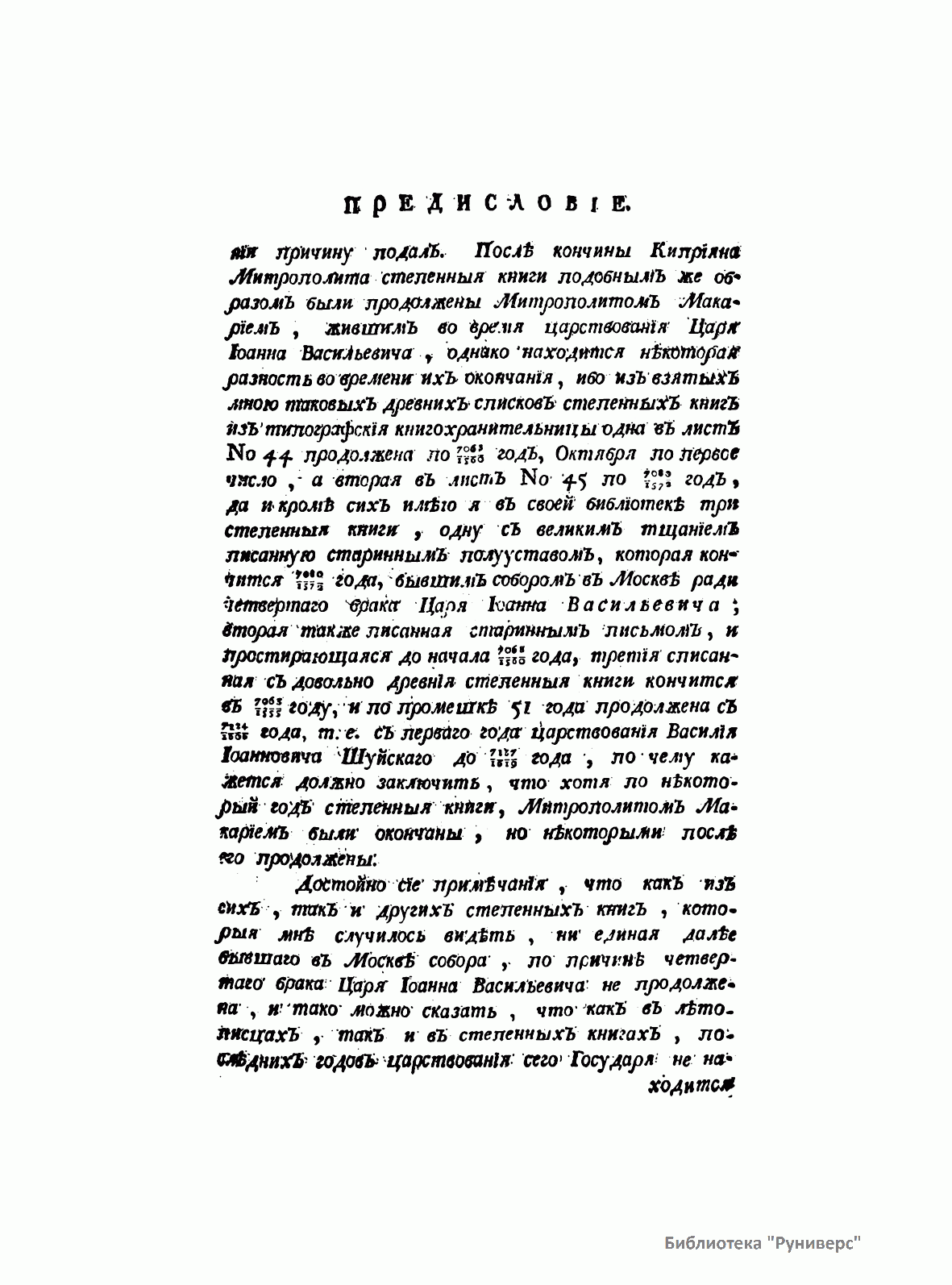 (также князю доверили разобрать и систематизировать архив Петра I). Начиная с 1770 г. вышло 7 томов, охватывающих историю России с древнейших времен до 1610 г. Следуя за идеями французских просветителей, Щербатов не только описывал действия исторических личностей, но и указывал, что за их поступками кроются определенные мысли, идеи, нравы, господствующие в обществе. И это было новым по отношению к предшествующей историографии.