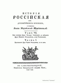 (также князю доверили разобрать и систематизировать архив Петра I). Начиная с 1770 г. вышло 7 томов, охватывающих историю России с древнейших времен до 1610 г. Следуя за идеями французских просветителей, Щербатов не только описывал действия исторических личностей, но и указывал, что за их поступками кроются определенные мысли, идеи, нравы, господствующие в обществе. И это было новым по отношению к предшествующей историографии.