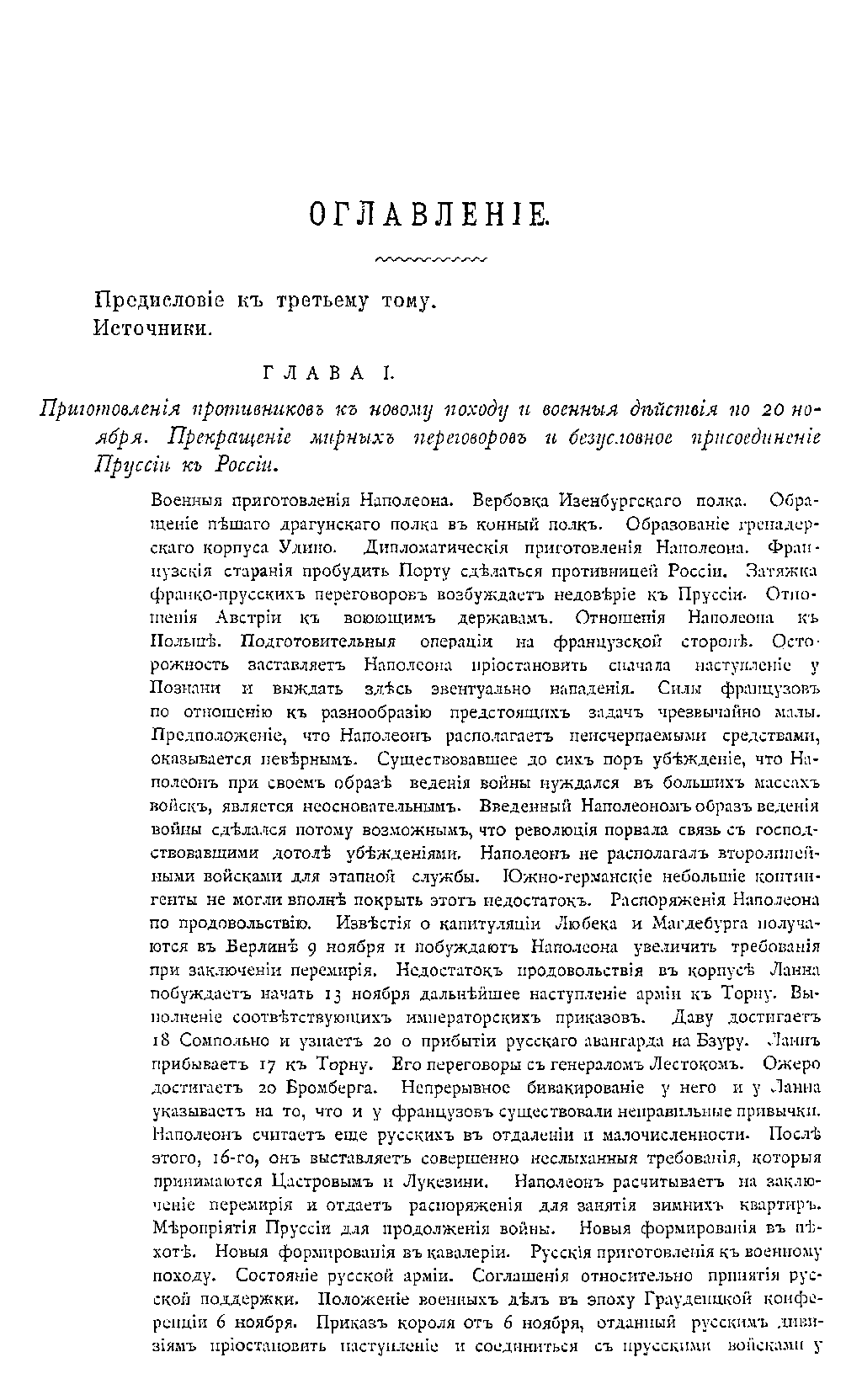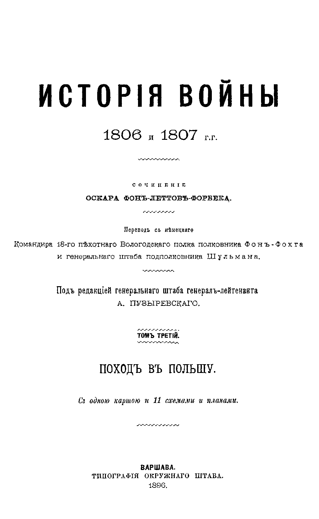 Перевод на русский язык фундаментального многотомного военно-исторического труда по истории войны русско-прусского союза с Наполеоном в 1806-1807 годах, написанного немецким военным историком Оскаром фон Леттов-Форбеком, был подготовлен при штабе Варшавского военного округа под руководством генерал-лейтенанта Генерального штаба, профессора военной истории академии Генерального штаба А.К. Пузыревского, получив при этом одобрение Военного министерства. Деятельность А.К. Пузыревского как одного из выдающихся военных педагогов и просветителей получила в России широкую известность. Представленное им исследование немецкого военного писателя, снабженное многочисленными картами и схемами боевых действий, сих пор представляет научный интерес. Одним из важнейших достоинств данного исследования является то, что автор широко использовал богатейший документальный массив как прусских, так и французских военных архивов, создав объективную картину одного из сложнейших этапов эпохи наполеоновских войн. Русско-прусско-французская война 1806-1807 гг. война между 4-й коалицией европейских держав (Великобритания, Россия, Пруссия, Саксония, Швеция) и наполеоновской Францией. Фактически эти две кампании являлась продолжением русско-австро-французской войны 1805 г. Не имея общего плана войны, союзники действовали несогласованно, что позволило Наполеону разбить их поочерёдно. Так 2 (14) октября 1806 г. в масштабном сражении под Йеной и Ауэрштадтом французская армия разгромила прусско-саксонские войска, после чего наполеоновские войска оккупировали большую часть Пруссии и 12 (24) октября заняли Берлин. Русская армия в составе трёх корпусов (около 160 тыс. чел.) под командованием генерал-фельдмаршала М. Ф. Каменского сосредоточилась в районе Пултуск, Остроленка, Брест-Литовск, выдвинув передовые отряды к Висле. 16 (28) ноября французские войска заняли Варшаву. Наполеон предпринял попытку окружить главные силы русских войск, но 14 (26) декабря в сражении под Пултуском русские войска сорвали этот план, нанеся поражение корпусу маршала Ж. Ланна. Затем русская армия отошла в район Тыкоцина, а наполеоновские войска расположились на зимние квартиры. 4 (16) января 1807 русская армия под командованием нового командующего генерал-адъютанта Л.Л. Беннигсена начала наступление из района Бялы в Восточную Пруссию с целью не допустить занятия французами Кенигсберга и Пиллау и нанести поражение изолированным корпусам Нея и Бернадота. Наполеон, узнав о продвижении русских войск, 20 января (1 февраля) направил главные силы на север, пытаясь обойти левый фланг русской армии и отрезать экспедиционные силы русских от России. Русские войска, ведя арьергардные бои, отошли к Прейсиш-Эйлау, где 26–27 января (7– 8 февраля) произошло встречное упорное сражение, в котором русские войска успешно отразили удары наполеоновской армии. 2 (14) июня 1807 г. в сражении под Фридландом русская армия, проявив чудеса героизма и мужества, вследствие неадекватных мер командования, была вынуждена отступить. В июне 1807 г. состоялось свидание Наполеона с императором Александром I в Тильзите и был подписан тяжёлый для России вынужденный союзный договор с наполеоновской Францией. Все эти военно-исторические события детально изложены в данном труде.