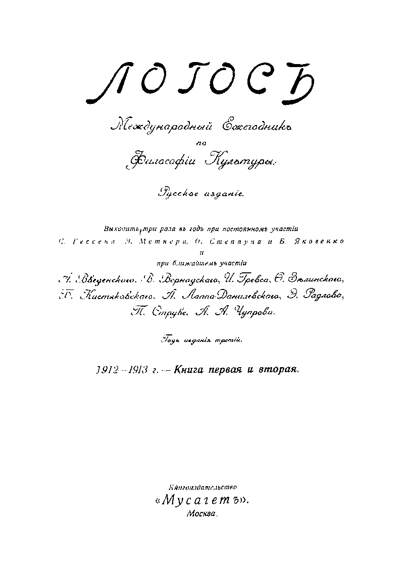 ) и немецких философов (Р. Кронер, Г. Мелис). В Москве журнал выходил в издательстве «Мусагет», а позже – в «Товариществе Н. О. Вольфа». В Тюбингене издателем был Зибек.
