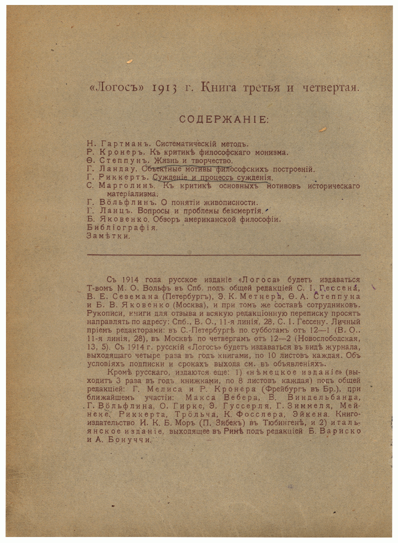 вышли из журнала. В русской версии «Логоса» участвовали и иностранные философы: Г. Зиммель, Г. Риккерт, Р. Кронер, Г. Вёльфлин, B. Виндельбанд, Н. Гартман, П. Наторп, Б. Кроче, Э. Бутру.