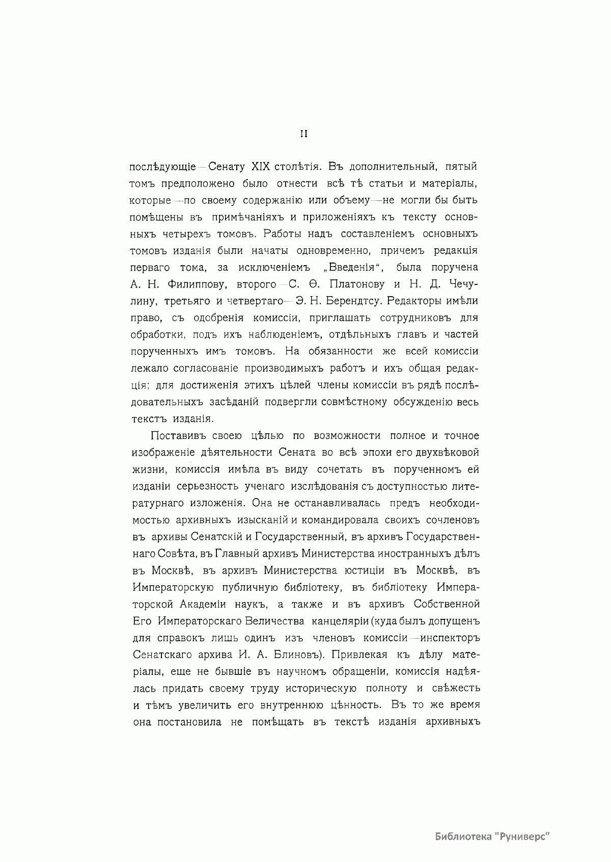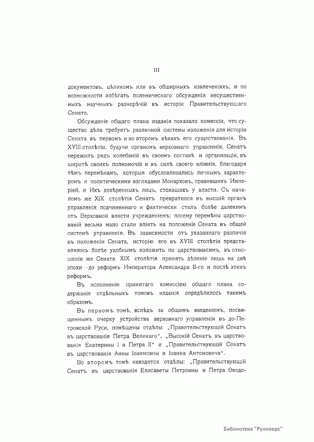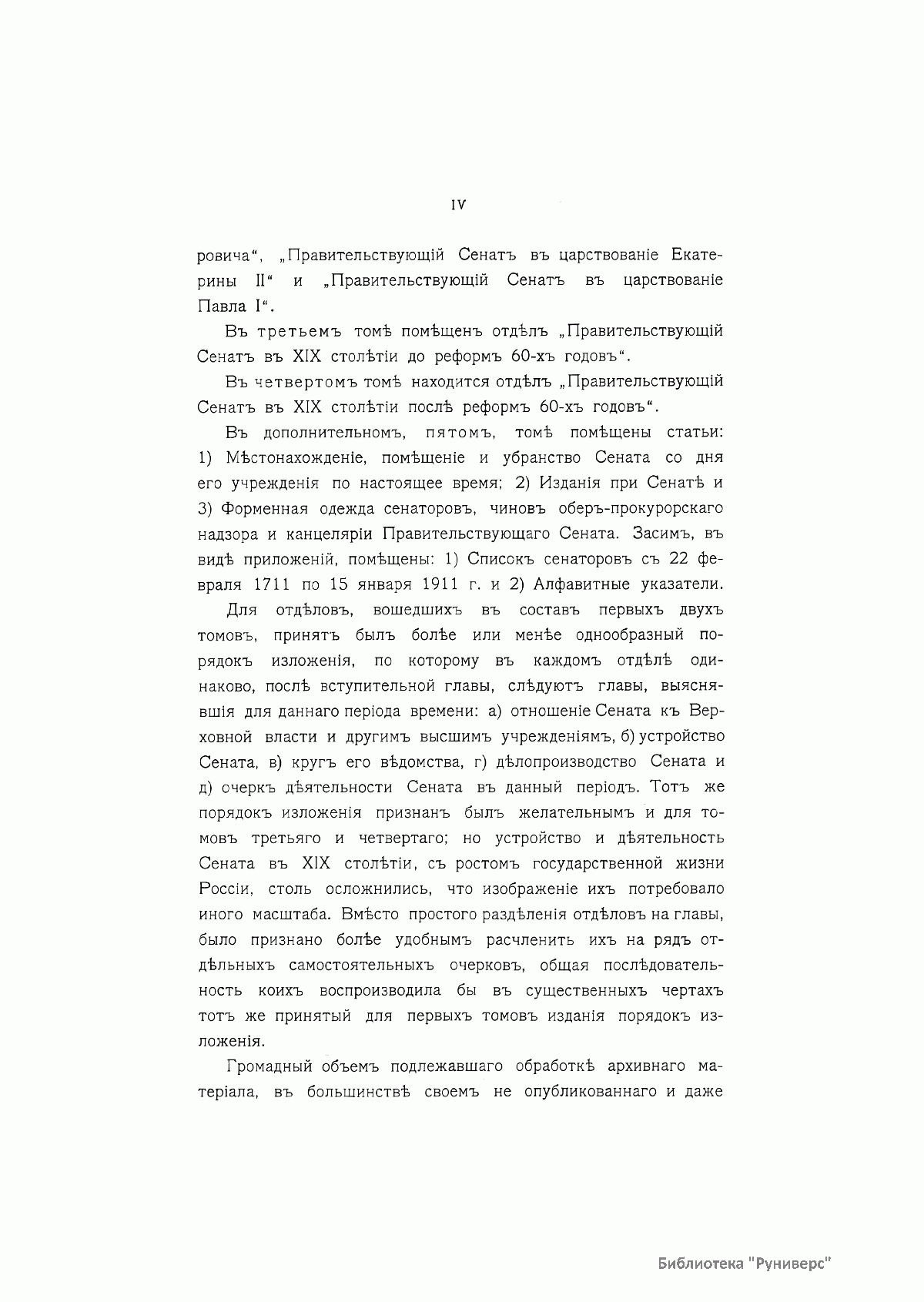 Настоящее издание посвящено истории Правительствующего сената — высшего государственного органа Российской империи, подчиненного императору. Учрежденный Петром Великим, за годы своего существования Сенат претерпевал значительные изменения, поскольку каждый русский монарх видоизменял этот орган в соответствии с собственным видением задач государственного управления. В данном издании все изменения функций Сената прослежены преимущественно по периодам правлений русских монархов. Первый и второй тома посвящены истории Сената в XVIII в., материалы, относящиеся к деятельности Сената в XIX в., составляют третий и четвертый тома. В дополнительный пятый том вошли статьи, посвященные местонахождению и убранству Сената, изданиям при Сенате, форменной одежде сенаторов, чинов обер-прокурорского надзора и канцелярии Сената, в качестве приложений помещены список сенаторов за 200 лет и алфавитные указатели. Составлением этого фундаментального труда занималась специальная комиссия под председательством сенатора Н. А. Добровольского. Редактура отдельных томов была возложена на заслуженного ординарного профессора Императорского Московского университета А. Н. Филиппова, ординарного профессора Санкт-Петербургского университета С. Ф. Платонова, доктора русской истории, библиотекаря Императорской публичной библиотеки Н. Д. Чечулина, ординарного профессора Императорского училища правоведения Э. Н. Берендтса. При этом редакторы, с одобрения комиссии, могли привлекать сотрудников для обработки отдельных глав и частей томов (в общей сложности подготовкой текстовой части занимались 17 человек). Перед составителями истории Сената была поставлена конкретная цель: полное и точное изображение деятельности работы Сената во все эпохи его двухвековой деятельности должно было сочетать в себе серьезность научного исследования и доступность литературного изложения. В подготовке издания использовались материалы почти всех центральных архивов и библиотек России, в том числе закрытого для широко доступа архива Собственной его императорского величества канцелярии. В результате проделанной работы вышел в свет труд, отличающийся исторической полнотой и новизной, в научное обращение было введено много ранее не опубликованных документов. Издание иллюстрируют портреты императоров и сенаторов, виды зданий Сената и интерьеров, факсимиле важнейших документов. Наиболее ценный художественный материал был получен из коллекций и изданий Великого князя Николая Михайловича и из коллекции П. Я. Дашкова; были также использованы коллекции Императорского Эрмитажа, Императорской публичной библиотеки и частных лиц.