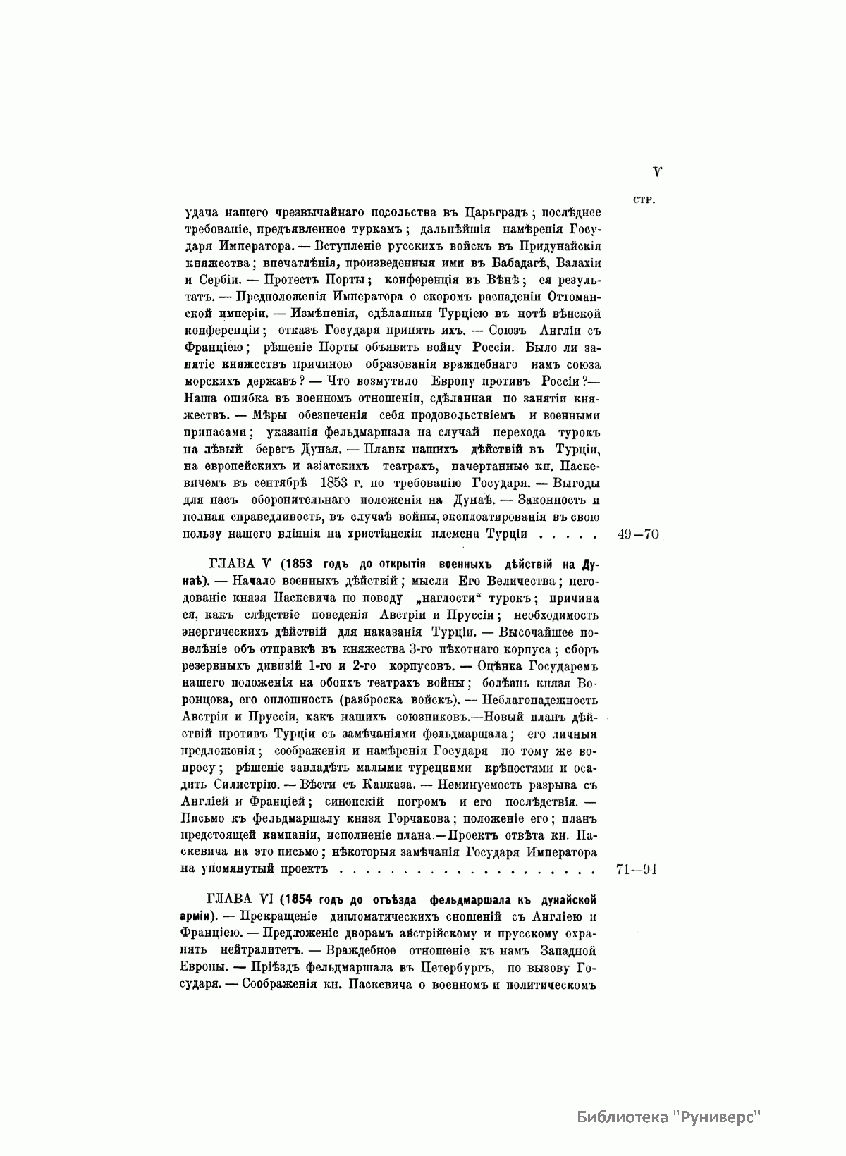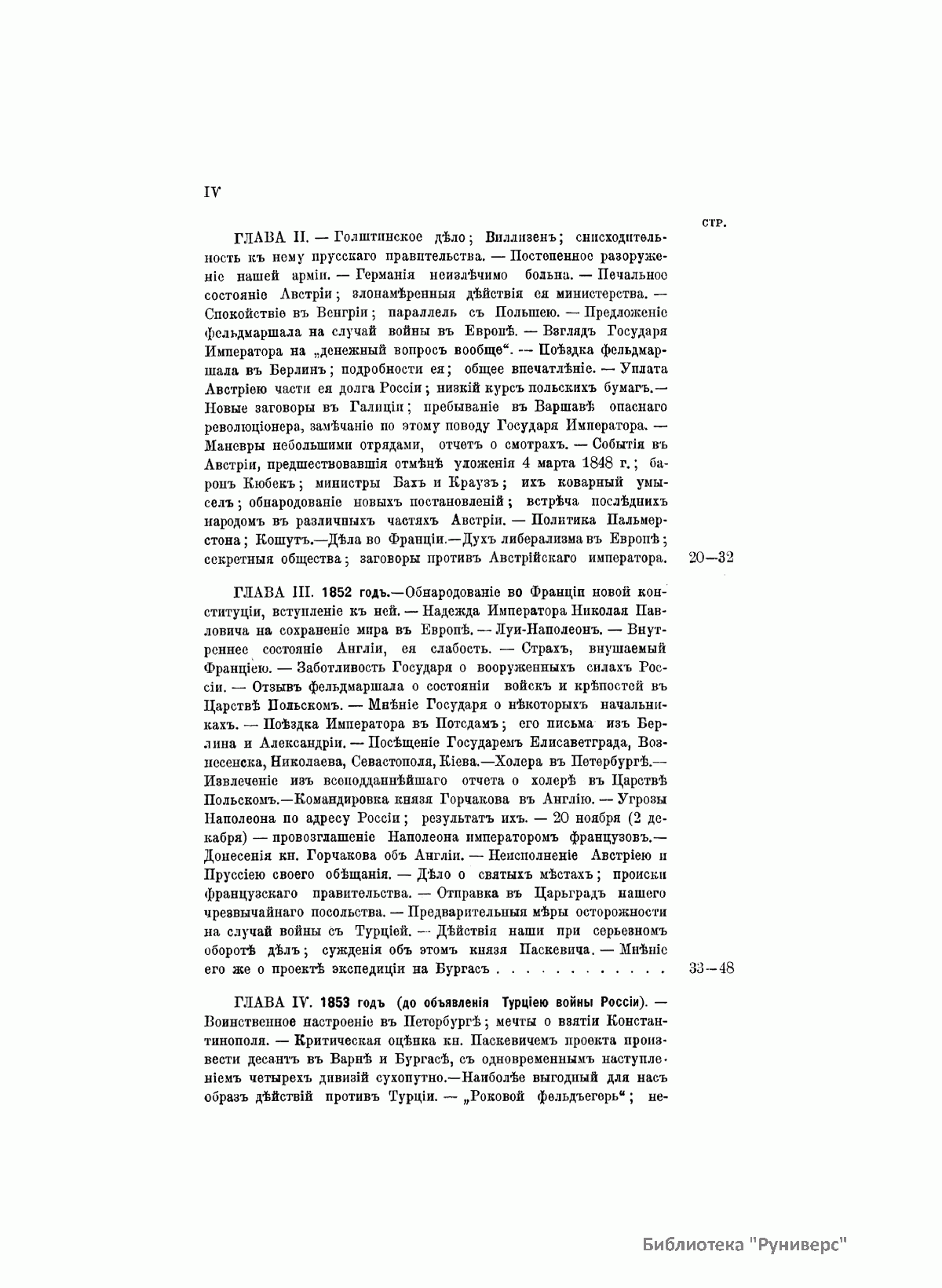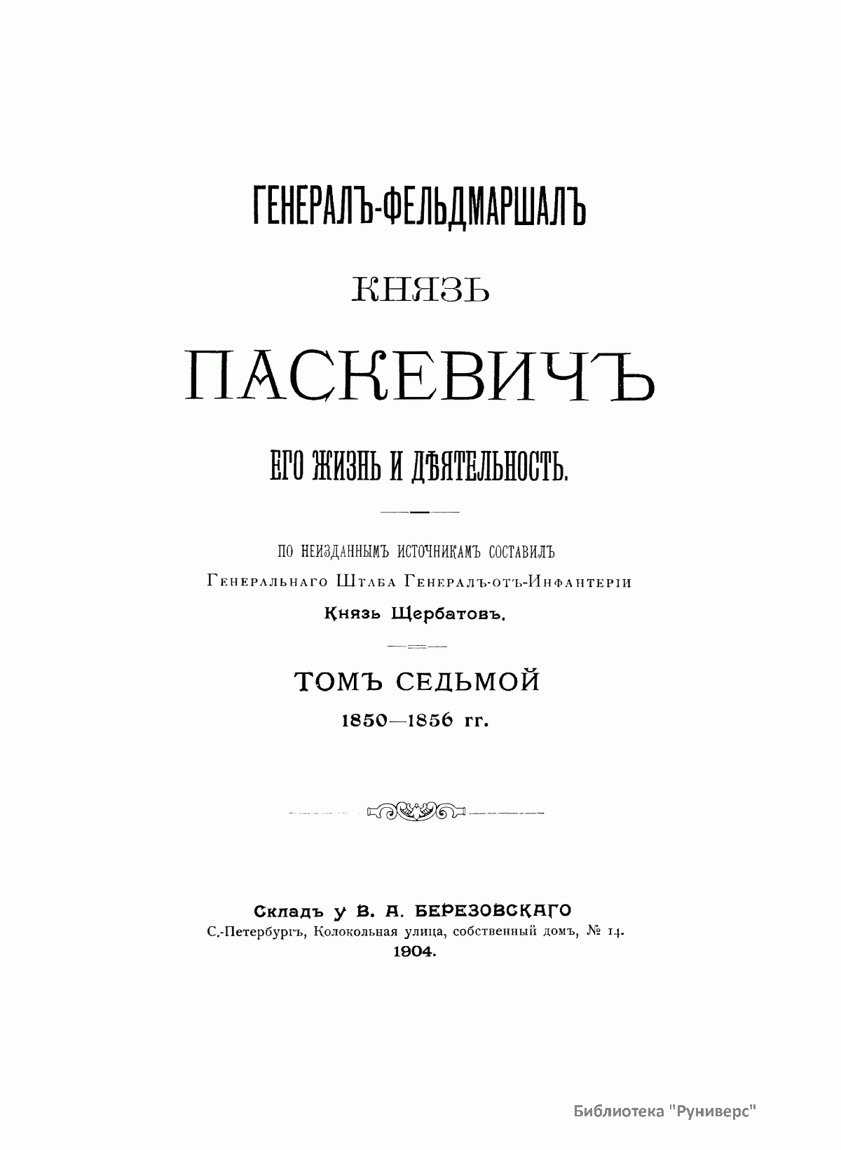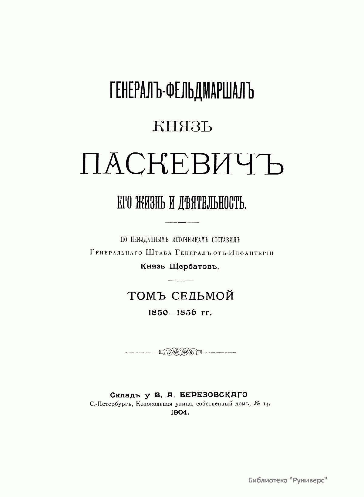 Данное издание князя Александра Петровича Щербатова (1836– ? ) представляет собой полное жизнеописание Ивана Федоровича Паскевича (1782–1856) — графа Эриванского (1828), светлейшего князя Варшавского (1831), видного российского военного и государственного деятеля. Иван Федорович Паскевич участвовал в русско-турецкой войне 1806–1812 гг. Во время Отечественной войны 1812 г. и заграничных походов 1813–1814 гг. командовал дивизией. В 1817–1819 гг. состоял при великом князе Михаиле Павловиче, затем командовал гвардейской пехотной дивизией, в которой служил будущий император Николай I, что способствовало быстрой карьере Паскевича, ставшего одним из наиболее близких к Николаю I лиц. Был членом Верховного суда по делу декабристов. С 1826 г. командовал войсками в Закавказье, в марте 1827 г. стал наместником на Кавказе. Во время русско-иранской и русско-турецкой войн был главнокомандующим войсками на Кавказском театре военных действий. Руководил подавлением Польского восстания 1830–1831 гг., после чего был назначен наместником Царства Польского, проводил политику национального угнетения и русификации. В 1849 г. командовал войсками при подавлении Венгерской революции (1848–1849). Во время Крымской войны (1853–1856) был главнокомандующим войсками на западных границах и на Дунае. Этот капитальный труд, основанный на подлинных архивных документах, иллюстрируют планы сражений и карты театров военных действий, в которых принимал участие И. Ф. Паскевич.