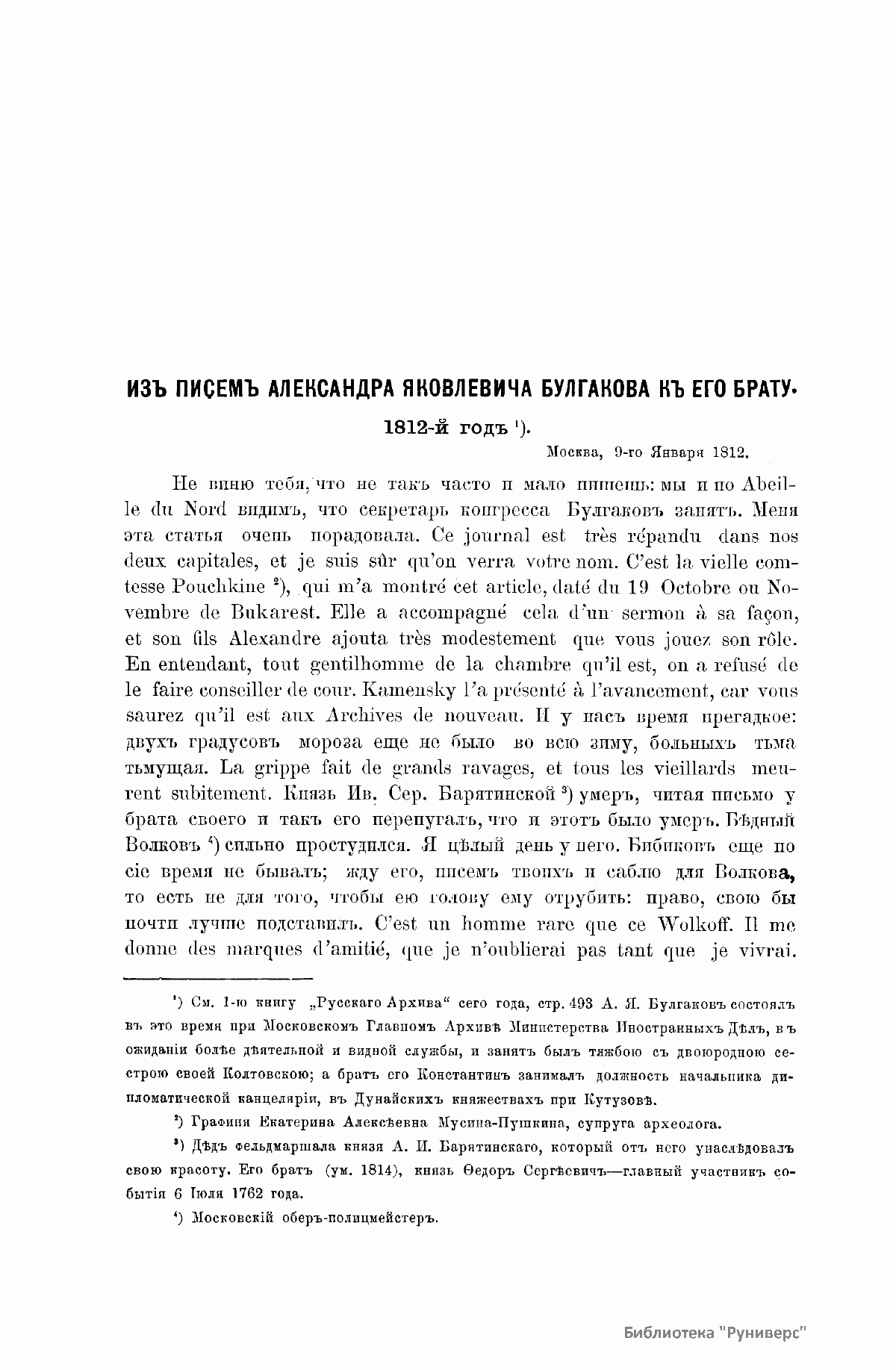«Русский архив» — ежемесячный историко-литературный журнал, издававшийся в Москве с 1863 по 1917 год. Создателем и продолжительные годы редактором журнала был П. И. Бартенев – историк, археограф, библиограф. Этот журнал называли «живой картиной былого», поскольку он содержал преимущественно публикации неизданных мемуарных, эпистолярных, литературно-художественных и ведомственных документальных материалов, освещавших культурную и политическую историю России в XVIII и XIX вв. По числу опубликованных источников «Русский архив» стоит на первом месте среди русских исторических журналов.