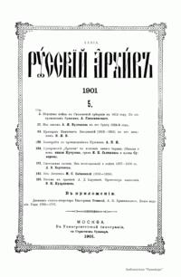 «Русский архив» — ежемесячный историко-литературный журнал, издававшийся в Москве с 1863 по 1917 год. Создателем и продолжительные годы редактором журнала был П. И. Бартенев – историк, археограф, библиограф. Этот журнал называли «живой картиной былого», поскольку он содержал преимущественно публикации неизданных мемуарных, эпистолярных, литературно-художественных и ведомственных документальных материалов, освещавших культурную и политическую историю России в XVIII и XIX вв. По числу опубликованных источников «Русский архив» стоит на первом месте среди русских исторических журналов.