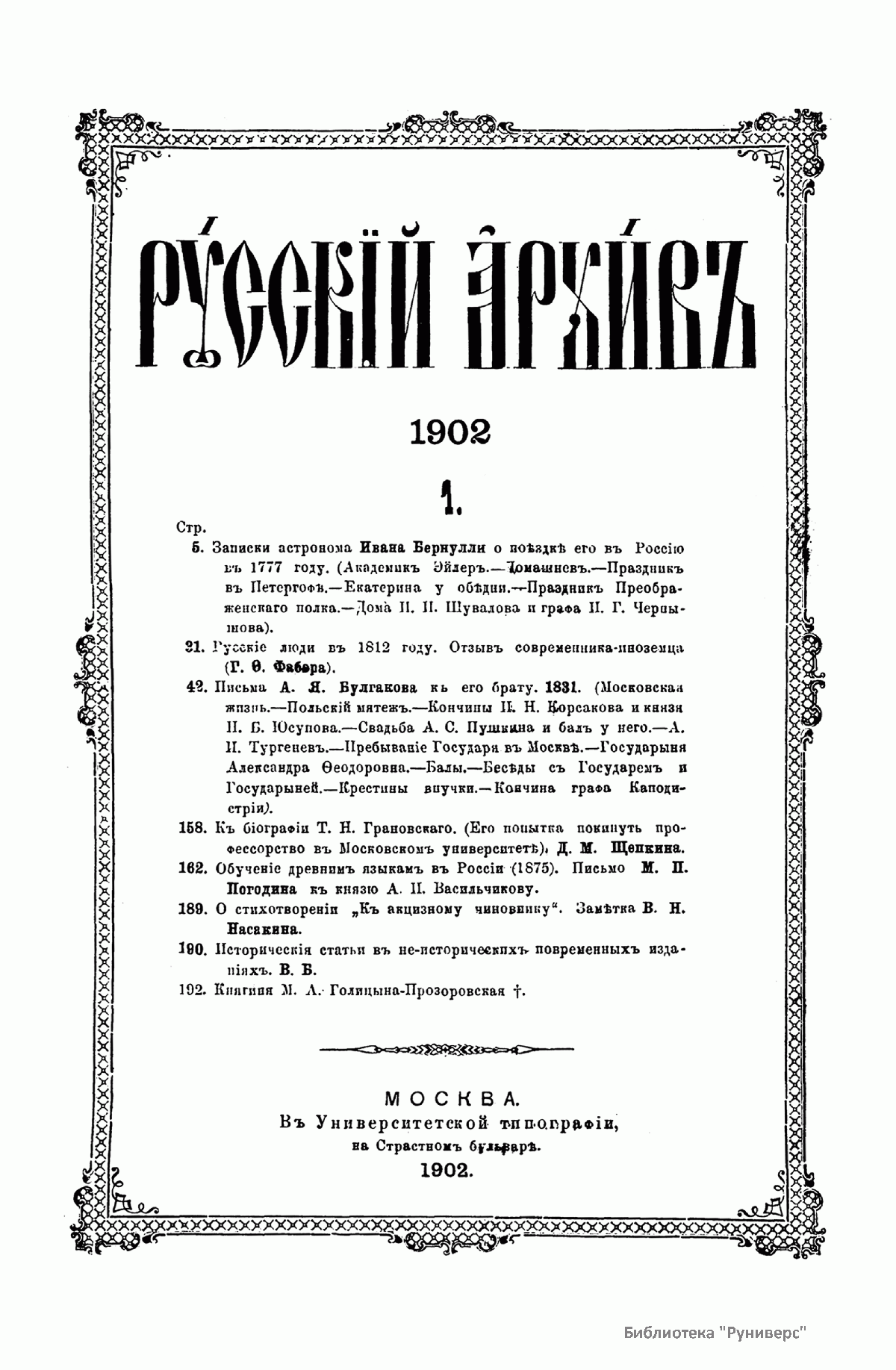 Русскiй архивъ. Историко-литературный сборникъ. 1902. Выпуски 1-4
