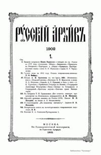 «Русский архив» — ежемесячный историко-литературный журнал, издававшийся в Москве с 1863 по 1917 год. Создателем и продолжительные годы редактором журнала был П. И. Бартенев – историк, археограф, библиограф. Этот журнал называли «живой картиной былого», поскольку он содержал преимущественно публикации неизданных мемуарных, эпистолярных, литературно-художественных и ведомственных документальных материалов, освещавших культурную и политическую историю России в XVIII и XIX вв. По числу опубликованных источников «Русский архив» стоит на первом месте среди русских исторических журналов.