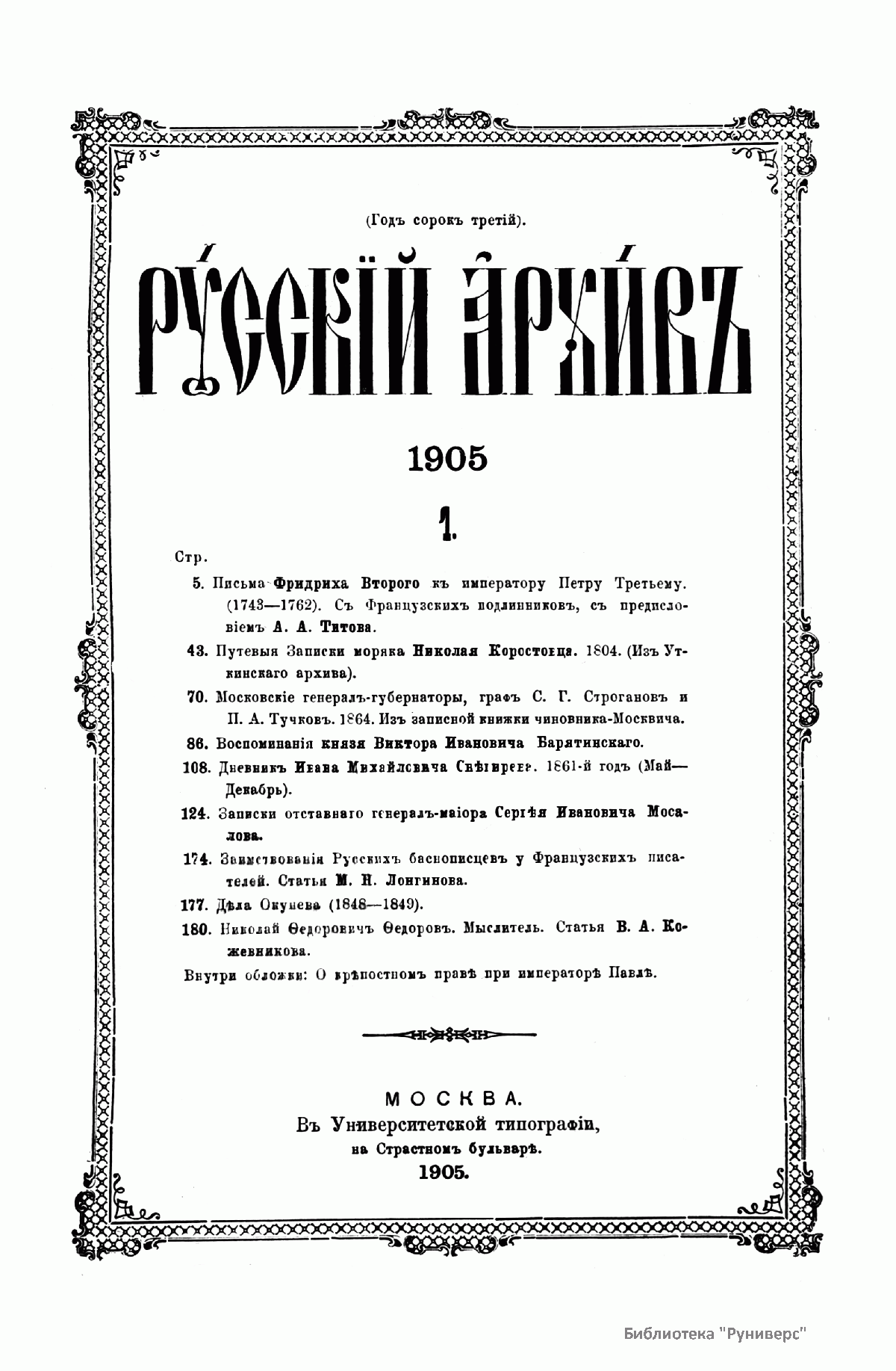Русскiй архивъ. Историко-литературный сборникъ. 1905. Выпуски 1-4