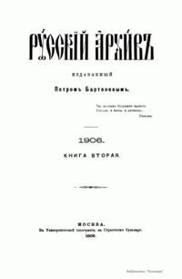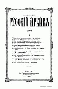 «Русский архив» — ежемесячный историко-литературный журнал, издававшийся в Москве с 1863 по 1917 год. Создателем и продолжительные годы редактором журнала был П. И. Бартенев – историк, археограф, библиограф. Этот журнал называли «живой картиной былого», поскольку он содержал преимущественно публикации неизданных мемуарных, эпистолярных, литературно-художественных и ведомственных документальных материалов, освещавших культурную и политическую историю России в XVIII и XIX вв. По числу опубликованных источников «Русский архив» стоит на первом месте среди русских исторических журналов.