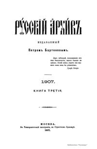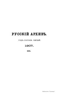 «Русский архив» — ежемесячный историко-литературный журнал, издававшийся в Москве с 1863 по 1917 год. Создателем и продолжительные годы редактором журнала был П. И. Бартенев – историк, археограф, библиограф. Этот журнал называли «живой картиной былого», поскольку он содержал преимущественно публикации неизданных мемуарных, эпистолярных, литературно-художественных и ведомственных документальных материалов, освещавших культурную и политическую историю России в XVIII и XIX вв. По числу опубликованных источников «Русский архив» стоит на первом месте среди русских исторических журналов.