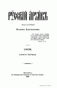 «Русский архив» — ежемесячный историко-литературный журнал, издававшийся в Москве с 1863 по 1917 год. Создателем и продолжительные годы редактором журнала был П. И. Бартенев – историк, археограф, библиограф. Этот журнал называли «живой картиной былого», поскольку он содержал преимущественно публикации неизданных мемуарных, эпистолярных, литературно-художественных и ведомственных документальных материалов, освещавших культурную и политическую историю России в XVIII и XIX вв. По числу опубликованных источников «Русский архив» стоит на первом месте среди русских исторических журналов.