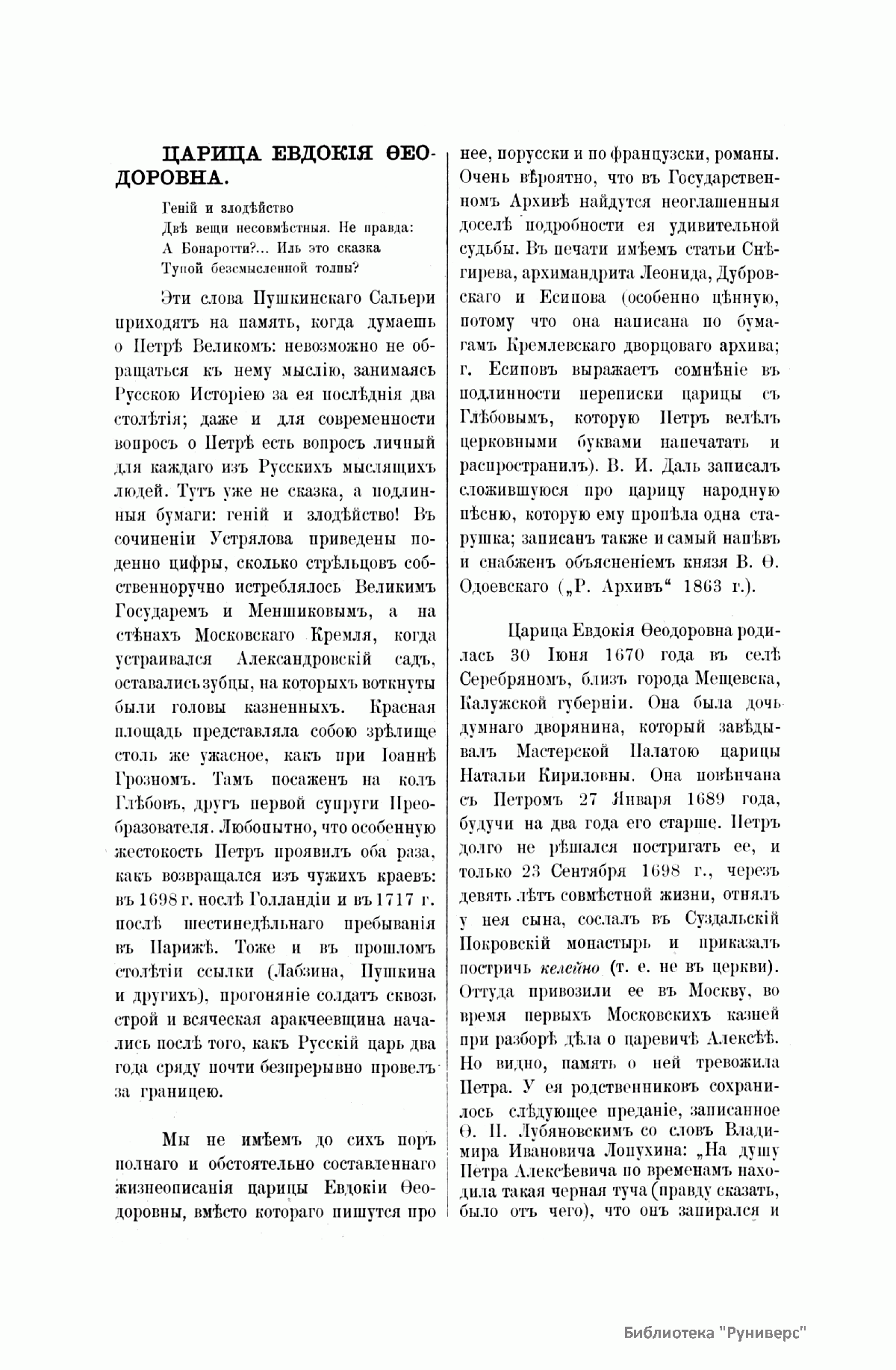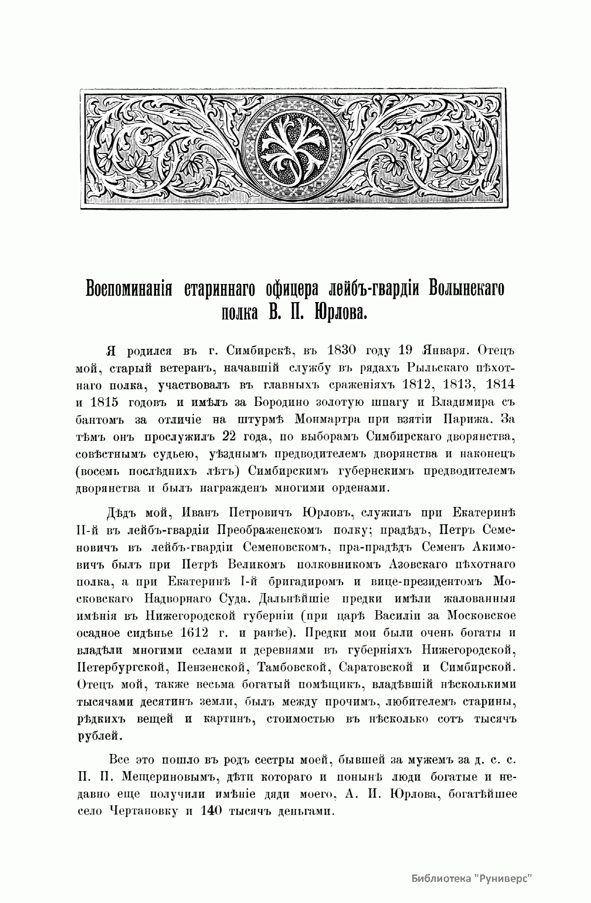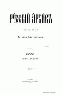 «Русский архив» — ежемесячный историко-литературный журнал, издававшийся в Москве с 1863 по 1917 год. Создателем и продолжительные годы редактором журнала был П. И. Бартенев – историк, археограф, библиограф. Этот журнал называли «живой картиной былого», поскольку он содержал преимущественно публикации неизданных мемуарных, эпистолярных, литературно-художественных и ведомственных документальных материалов, освещавших культурную и политическую историю России в XVIII и XIX вв. По числу опубликованных источников «Русский архив» стоит на первом месте среди русских исторических журналов.