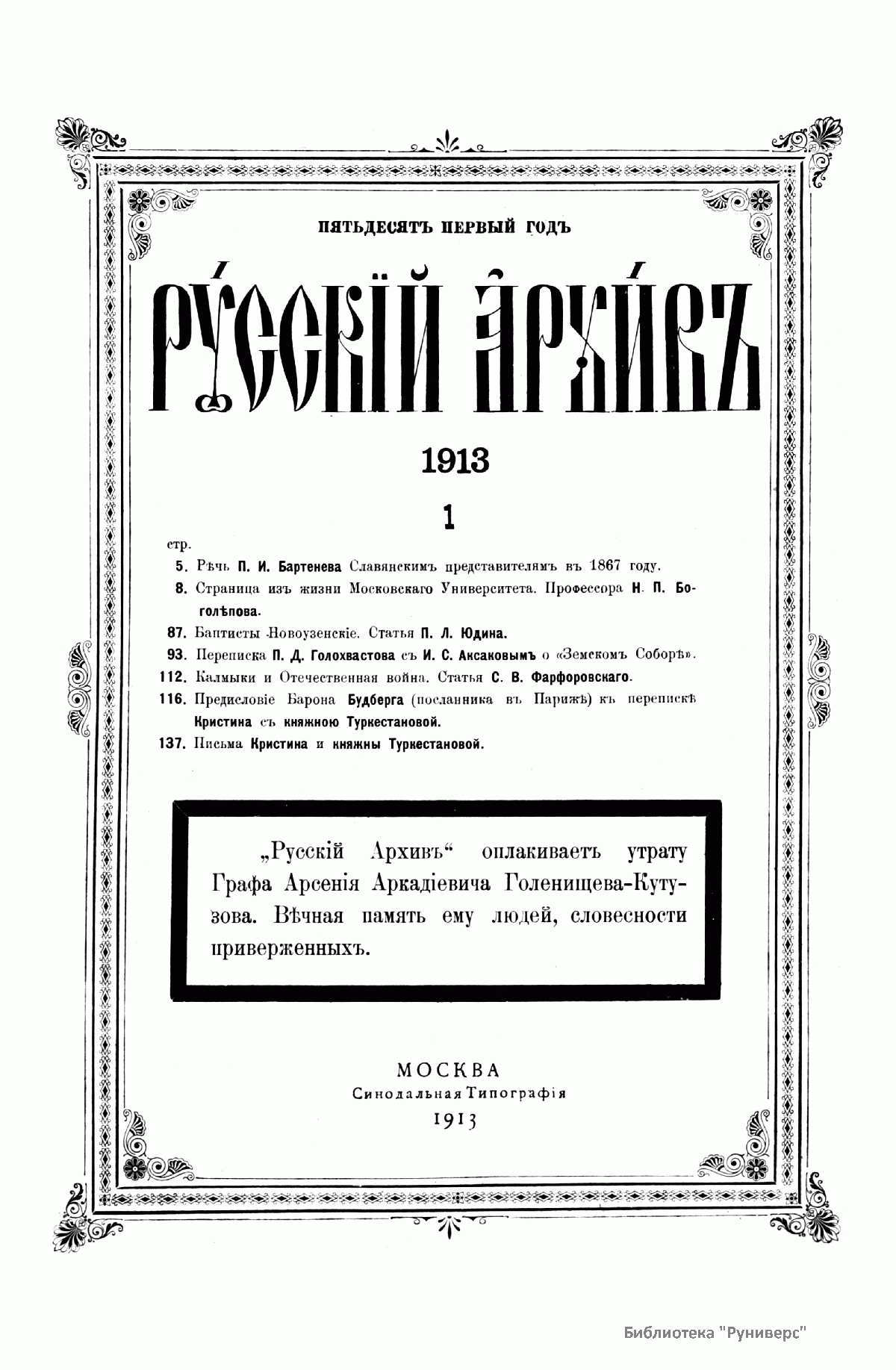 Русскiй архивъ. Историко-литературный сборникъ. 1913. Выпуски 1-6