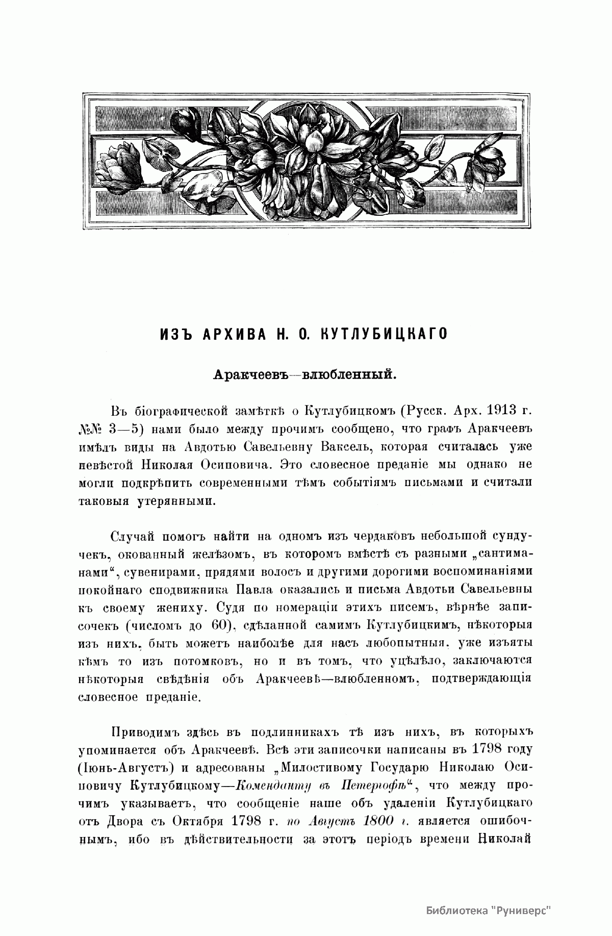 «Русский архив» — ежемесячный историко-литературный журнал, издававшийся в Москве с 1863 по 1917 год. Создателем и продолжительные годы редактором журнала был П. И. Бартенев – историк, археограф, библиограф. Этот журнал называли «живой картиной былого», поскольку он содержал преимущественно публикации неизданных мемуарных, эпистолярных, литературно-художественных и ведомственных документальных материалов, освещавших культурную и политическую историю России в XVIII и XIX вв. По числу опубликованных источников «Русский архив» стоит на первом месте среди русских исторических журналов.
