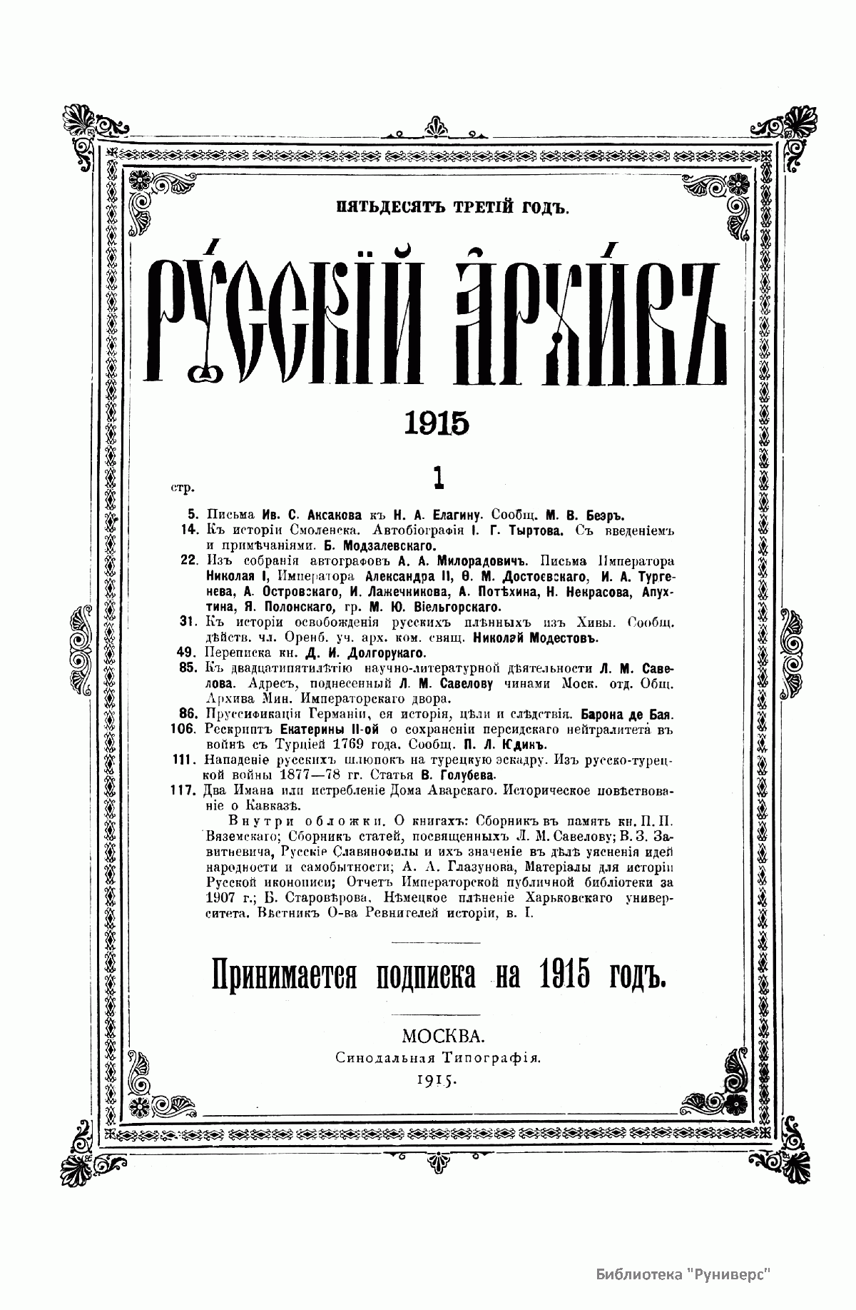 Русскiй архивъ. Историко-литературный сборникъ. 1915. Выпуски 1-4