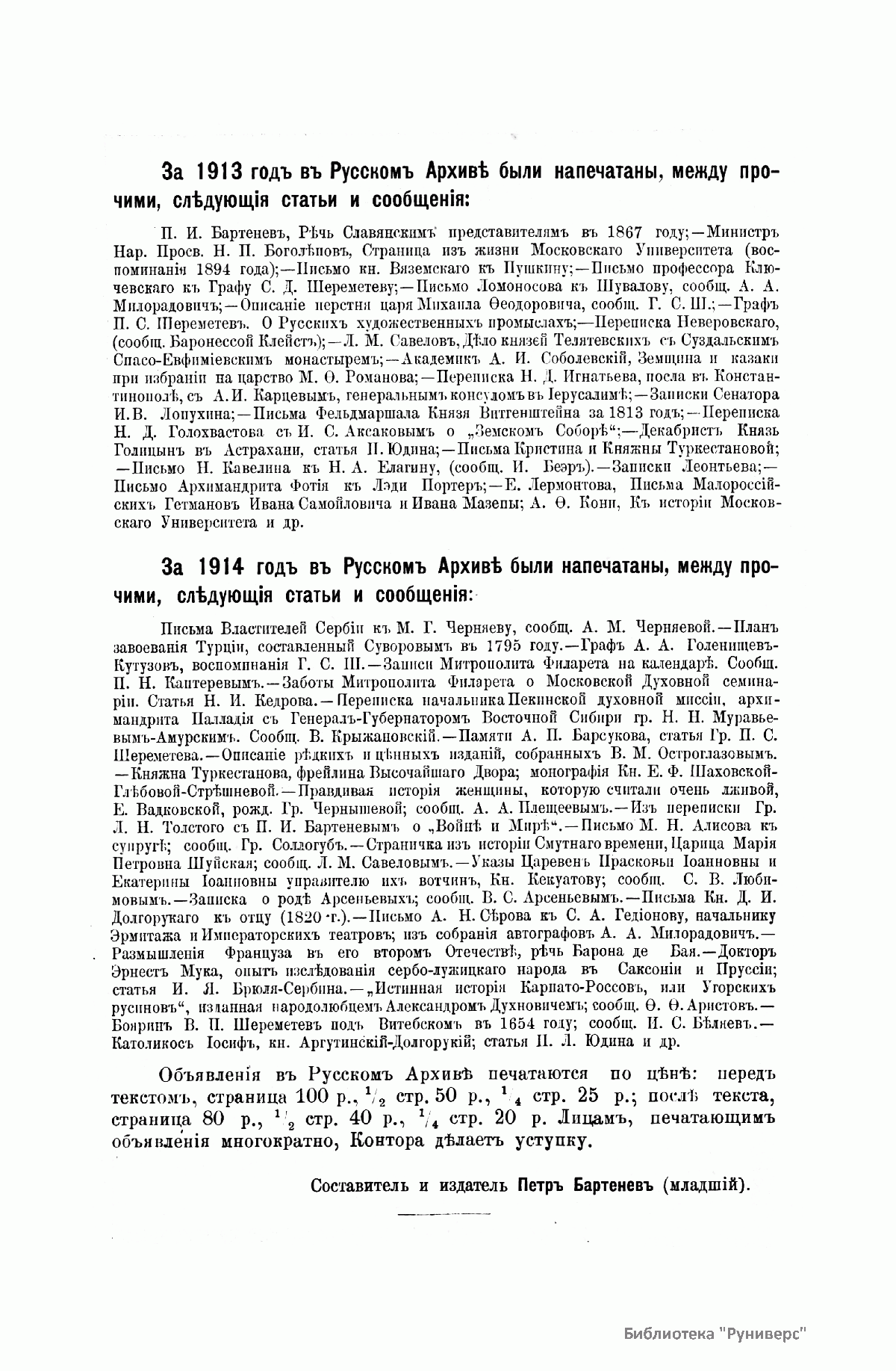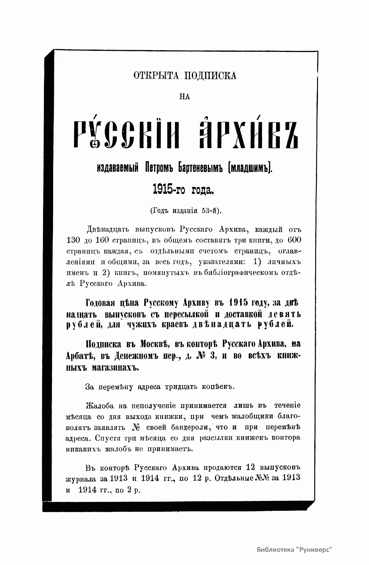 «Русский архив» — ежемесячный историко-литературный журнал, издававшийся в Москве с 1863 по 1917 год. Создателем и продолжительные годы редактором журнала был П. И. Бартенев – историк, археограф, библиограф. Этот журнал называли «живой картиной былого», поскольку он содержал преимущественно публикации неизданных мемуарных, эпистолярных, литературно-художественных и ведомственных документальных материалов, освещавших культурную и политическую историю России в XVIII и XIX вв. По числу опубликованных источников «Русский архив» стоит на первом месте среди русских исторических журналов.