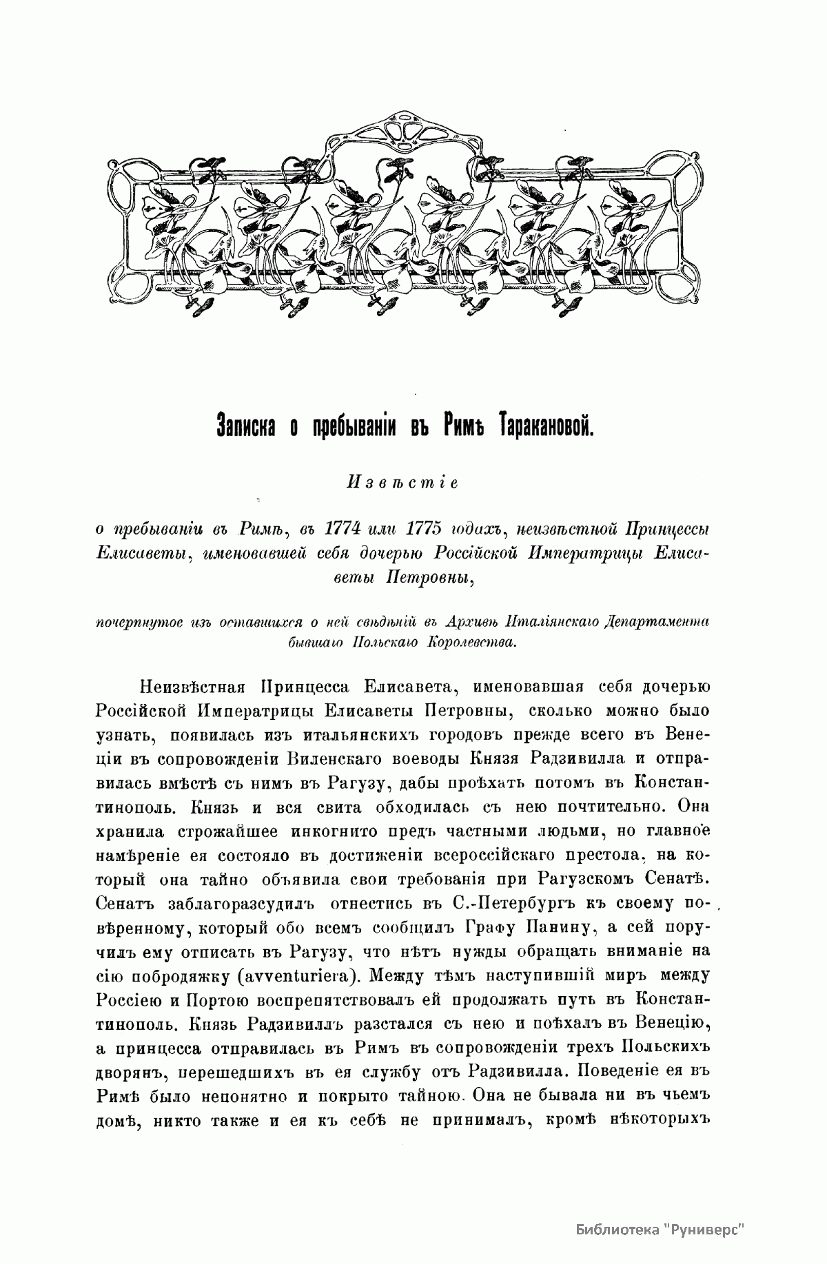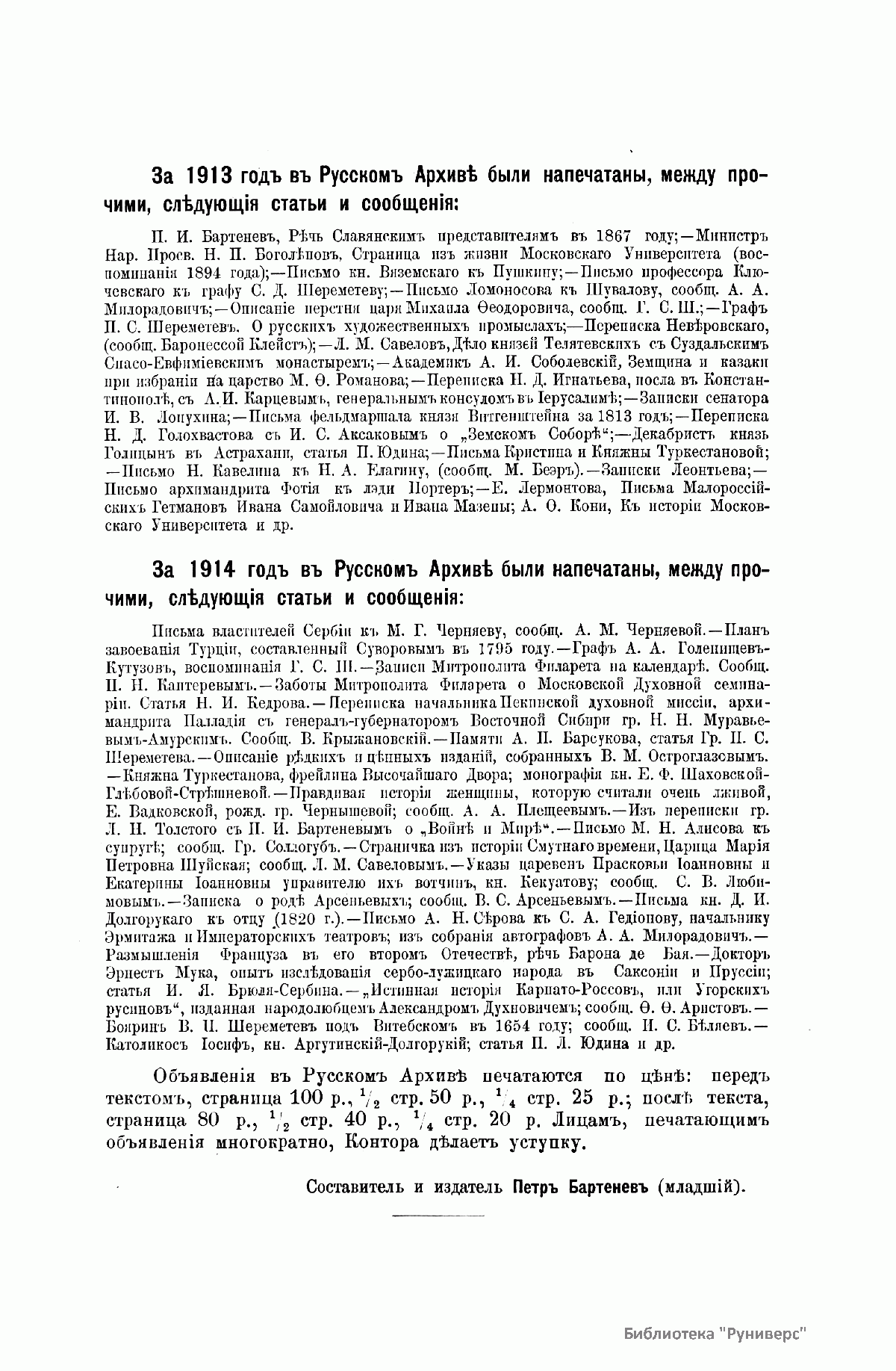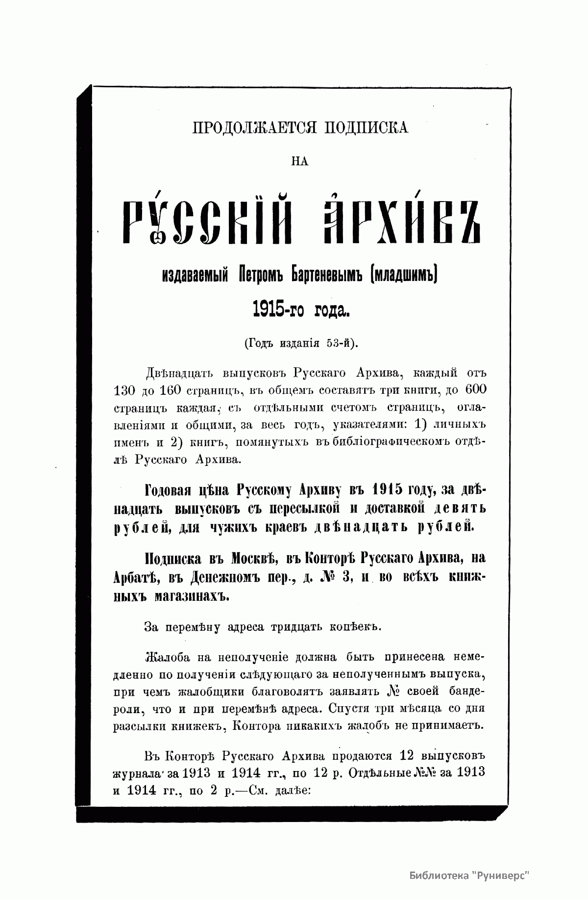 «Русский архив» — ежемесячный историко-литературный журнал, издававшийся в Москве с 1863 по 1917 год. Создателем и продолжительные годы редактором журнала был П. И. Бартенев – историк, археограф, библиограф. Этот журнал называли «живой картиной былого», поскольку он содержал преимущественно публикации неизданных мемуарных, эпистолярных, литературно-художественных и ведомственных документальных материалов, освещавших культурную и политическую историю России в XVIII и XIX вв. По числу опубликованных источников «Русский архив» стоит на первом месте среди русских исторических журналов.