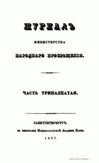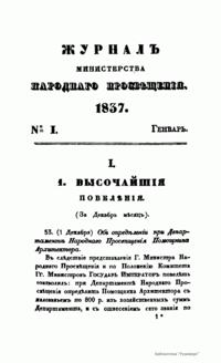Журнал Министерства народного просвещения выходил с 1834-го по 1917 год. Официальный периодический журнал об успехах просвещения в России. Издатели журнала уверены в том, что «если для каждого человека необходим выход из грубой тьмы невежества и беспрерывное дальнейшее движение к свету, то для народов необходимо попечительное участие правительства в образовании. Только правительство имеет все средства знать и высоту успехов всемирного образования, и настоящие нужды Отечества».