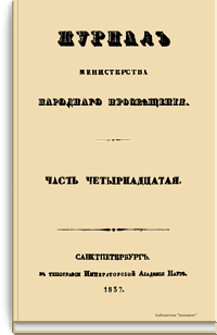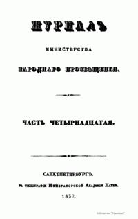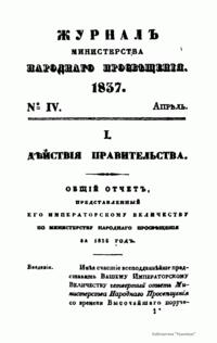 Журнал Министерства народного просвещения выходил с 1834-го по 1917 год. Официальный периодический журнал об успехах просвещения в России. Издатели журнала уверены в том, что «если для каждого человека необходим выход из грубой тьмы невежества и беспрерывное дальнейшее движение к свету, то для народов необходимо попечительное участие правительства в образовании. Только правительство имеет все средства знать и высоту успехов всемирного образования, и настоящие нужды Отечества».