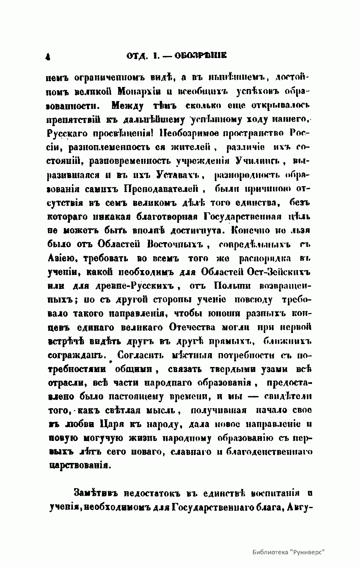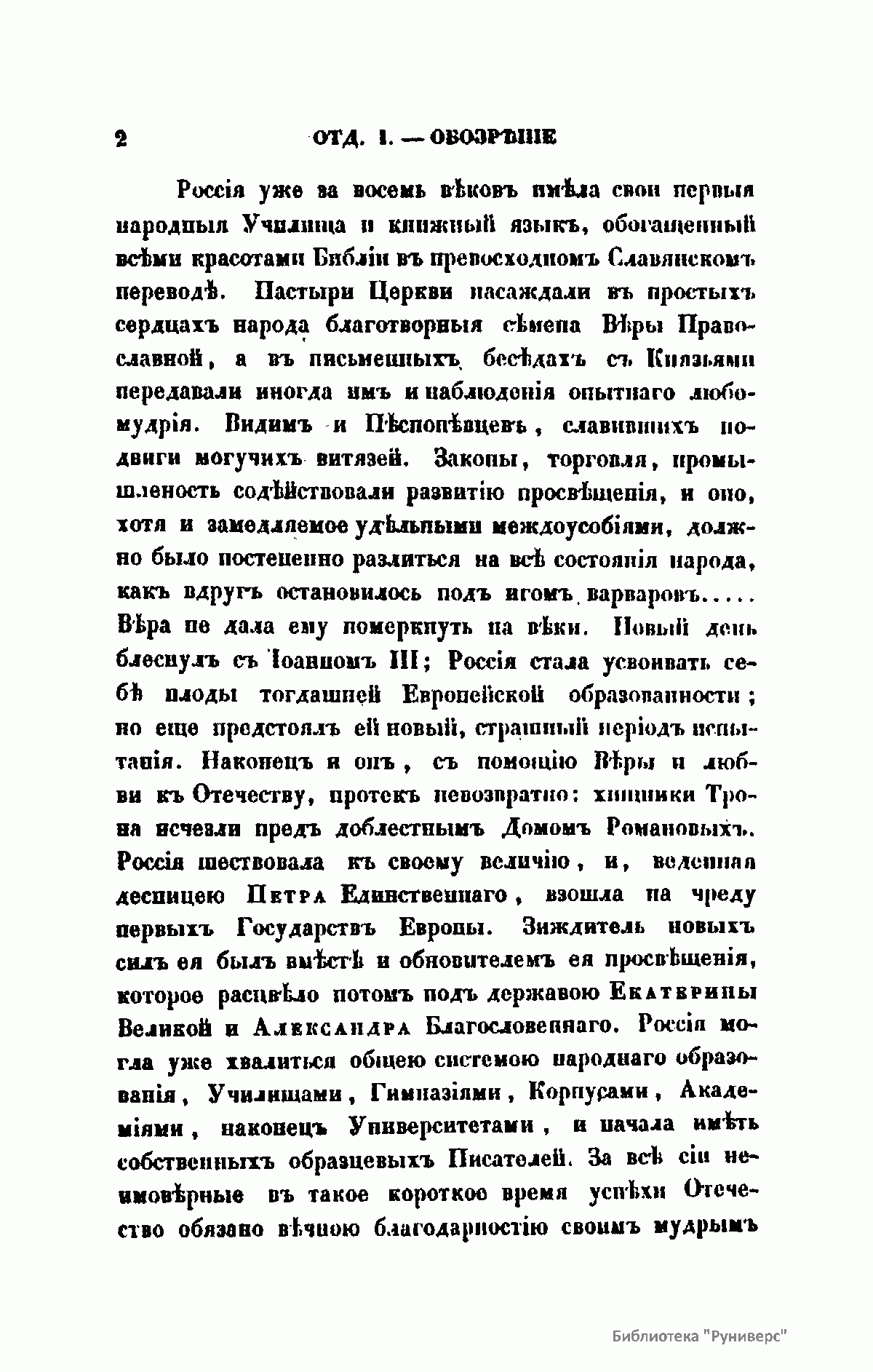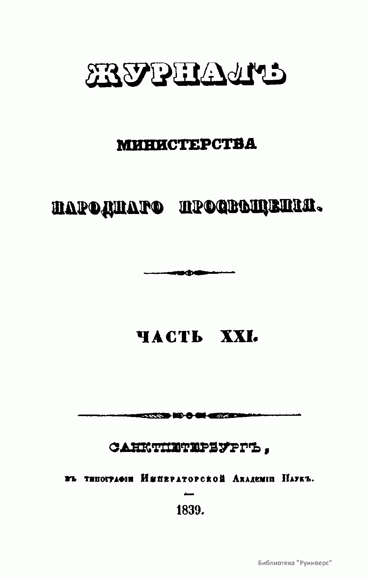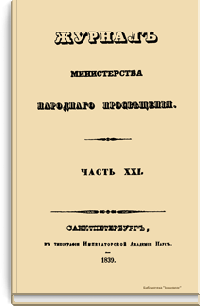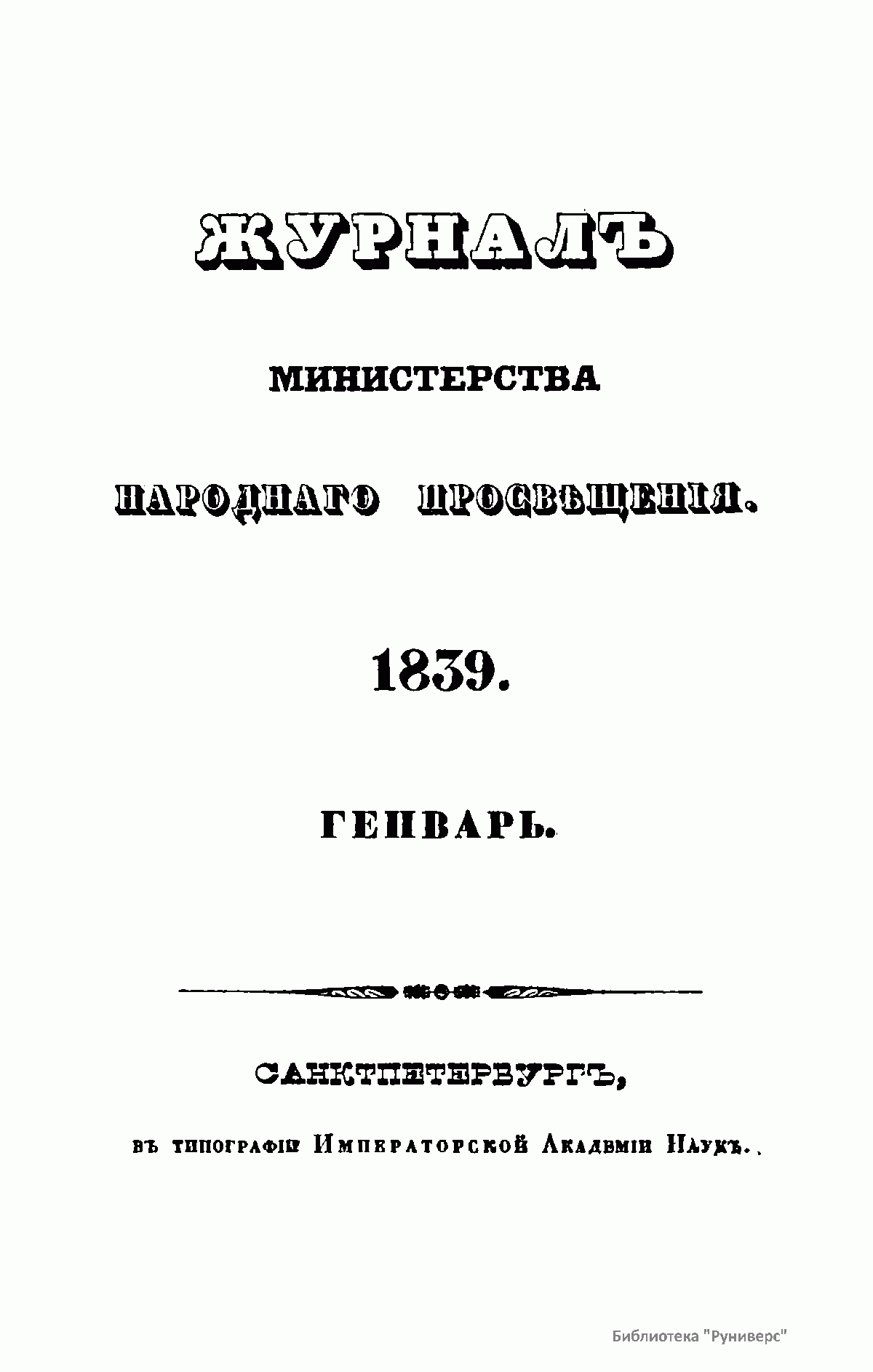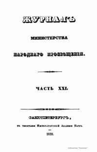 Журнал Министерства народного просвещения выходил с 1834-го по 1917 год. Официальный периодический журнал об успехах просвещения в России. Издатели журнала уверены в том, что «если для каждого человека необходим выход из грубой тьмы невежества и беспрерывное дальнейшее движение к свету, то для народов необходимо попечительное участие правительства в образовании. Только правительство имеет все средства знать и высоту успехов всемирного образования, и настоящие нужды Отечества».