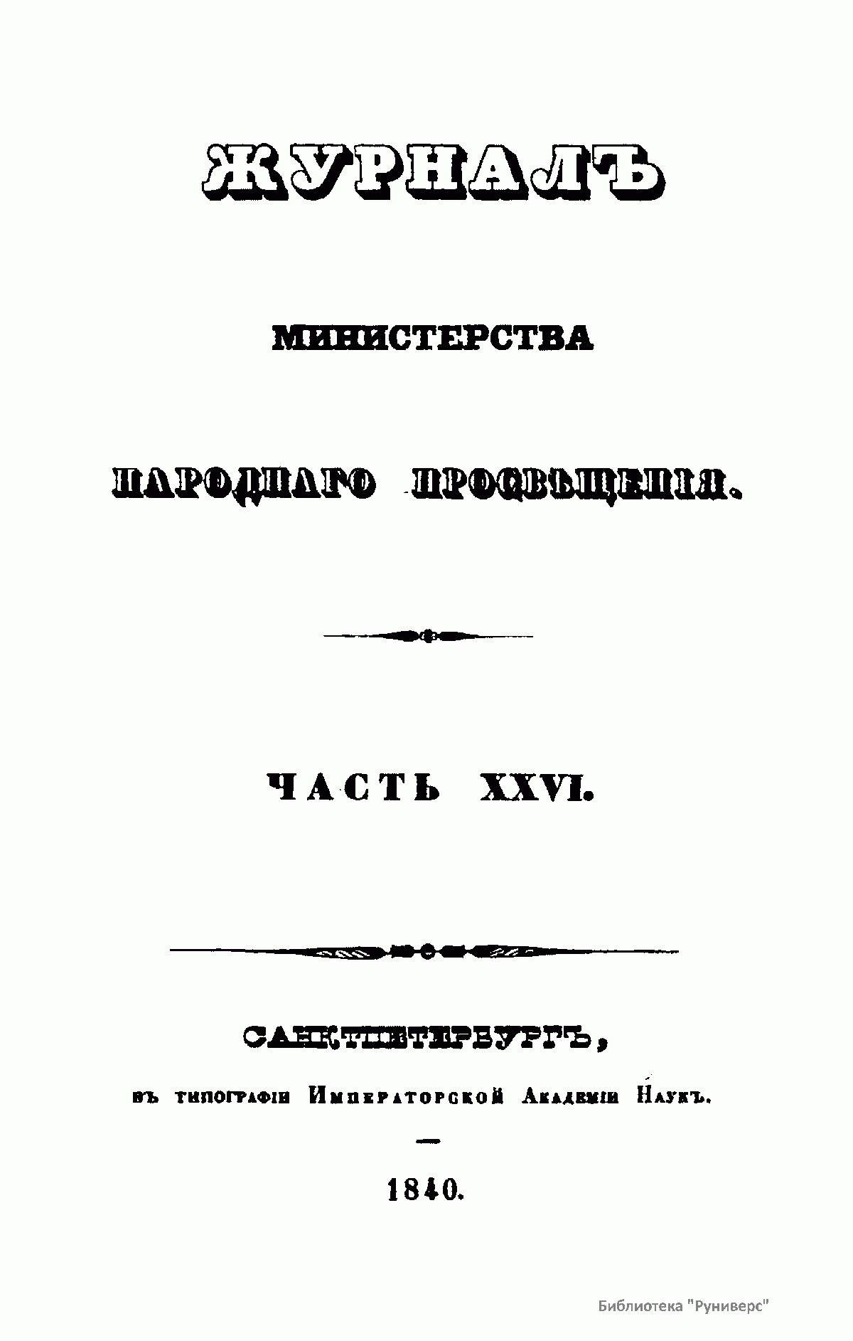 Журнал Министерства народного просвещения выходил с 1834-го по 1917 год. Официальный периодический журнал об успехах просвещения в России. Издатели журнала уверены в том, что «если для каждого человека необходим выход из грубой тьмы невежества и беспрерывное дальнейшее движение к свету, то для народов необходимо попечительное участие правительства в образовании. Только правительство имеет все средства знать и высоту успехов всемирного образования, и настоящие нужды Отечества».