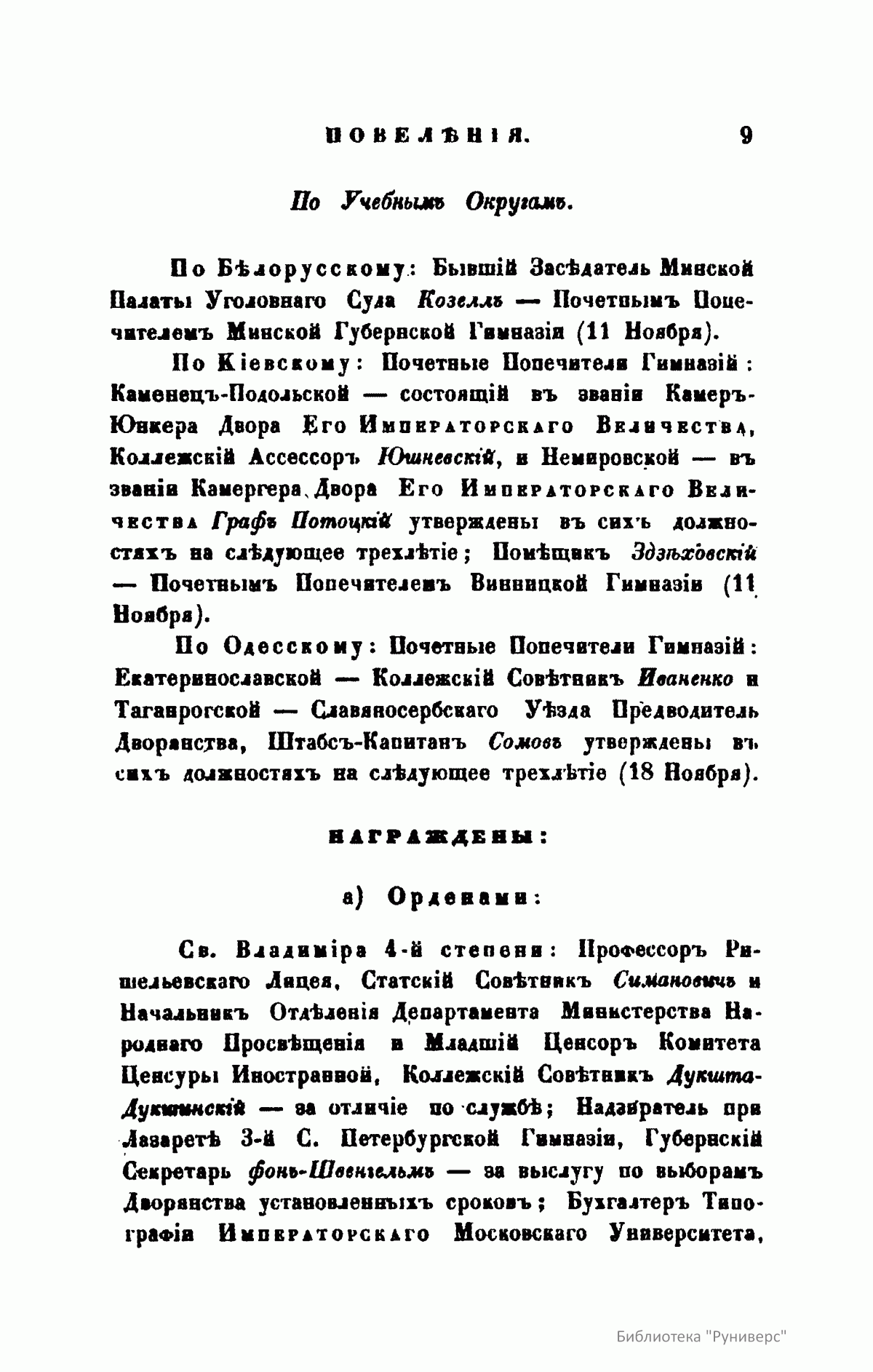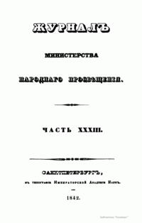 Журнал Министерства народного просвещения выходил с 1834-го по 1917 год. Официальный периодический журнал об успехах просвещения в России. Издатели журнала уверены в том, что «если для каждого человека необходим выход из грубой тьмы невежества и беспрерывное дальнейшее движение к свету, то для народов необходимо попечительное участие правительства в образовании. Только правительство имеет все средства знать и высоту успехов всемирного образования, и настоящие нужды Отечества».