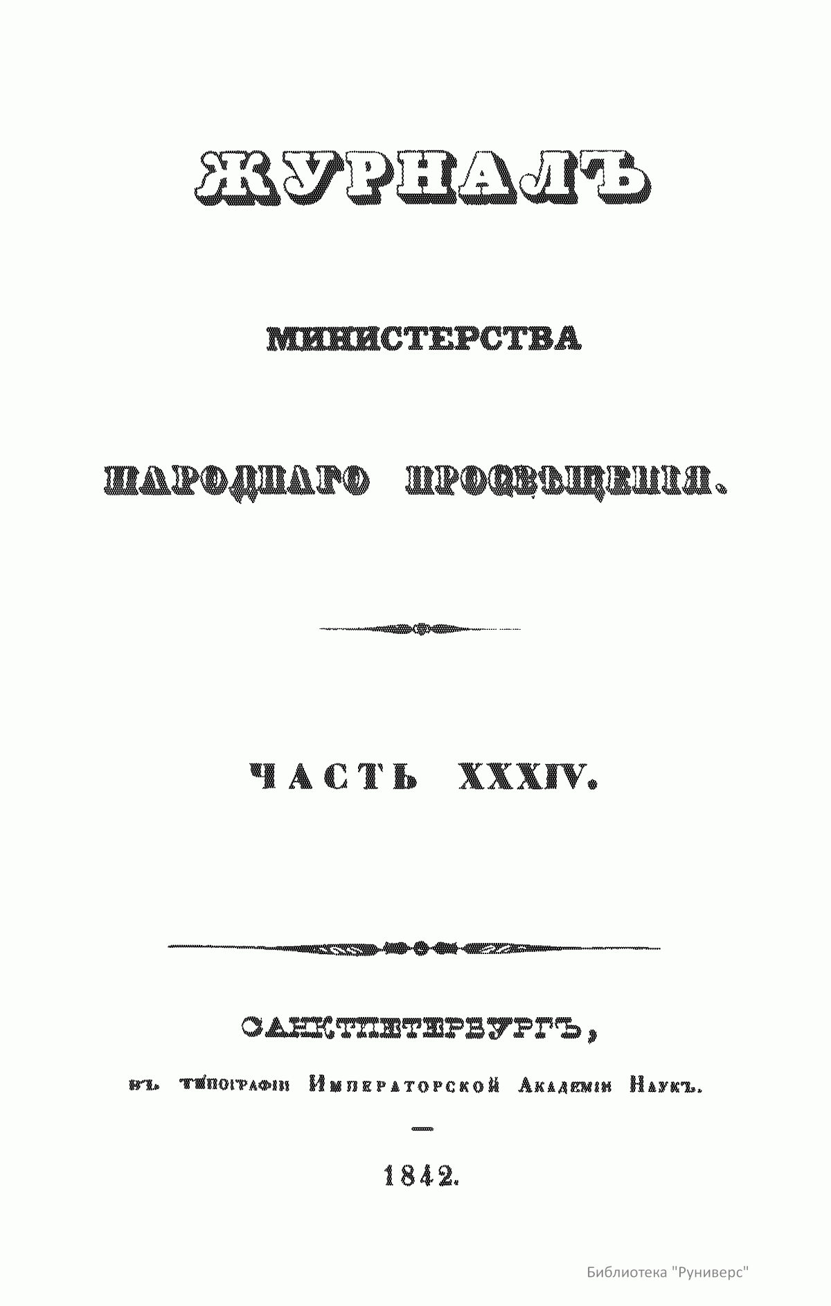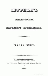 Журнал Министерства народного просвещения выходил с 1834-го по 1917 год. Официальный периодический журнал об успехах просвещения в России. Издатели журнала уверены в том, что «если для каждого человека необходим выход из грубой тьмы невежества и беспрерывное дальнейшее движение к свету, то для народов необходимо попечительное участие правительства в образовании. Только правительство имеет все средства знать и высоту успехов всемирного образования, и настоящие нужды Отечества».
