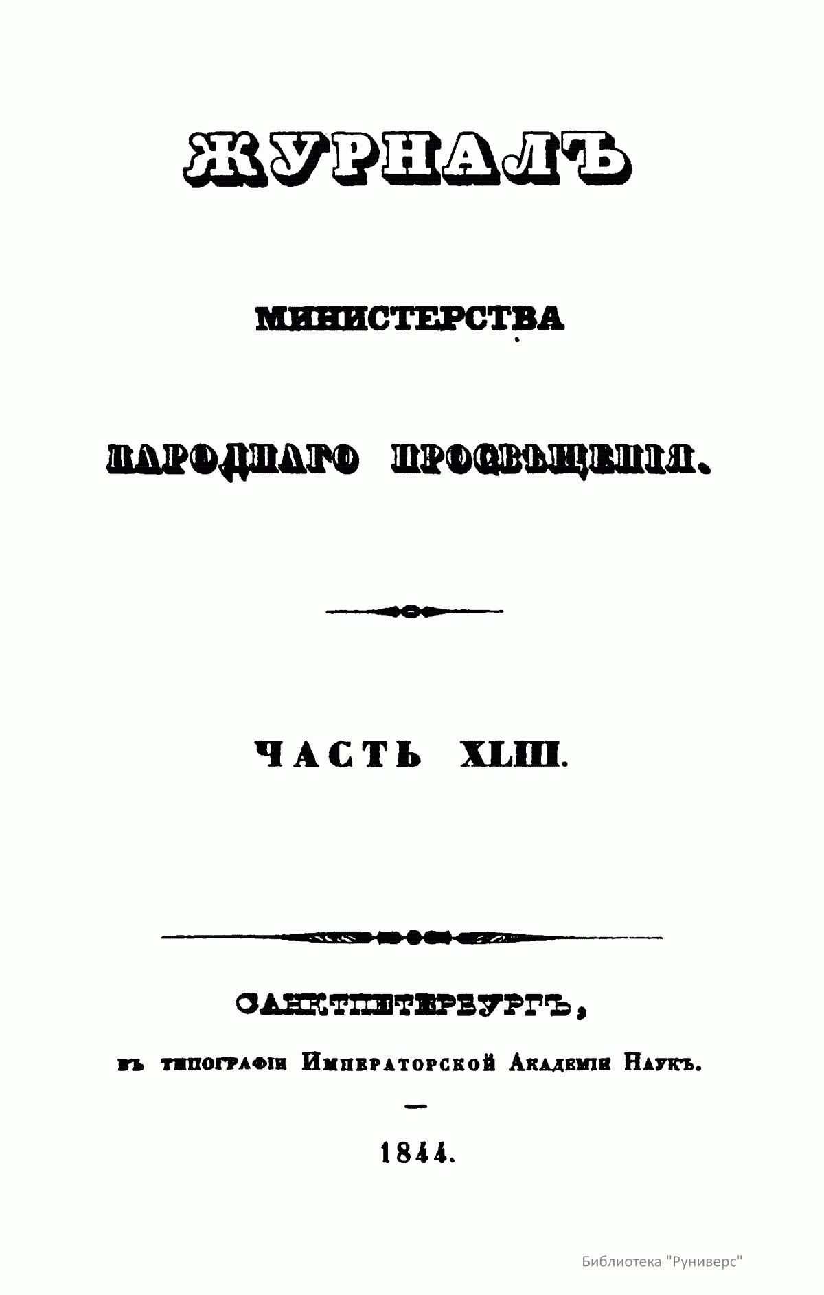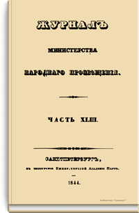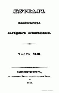 Журнал Министерства народного просвещения выходил с 1834-го по 1917 год. Официальный периодический журнал об успехах просвещения в России. Издатели журнала уверены в том, что «если для каждого человека необходим выход из грубой тьмы невежества и беспрерывное дальнейшее движение к свету, то для народов необходимо попечительное участие правительства в образовании. Только правительство имеет все средства знать и высоту успехов всемирного образования, и настоящие нужды Отечества».