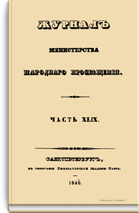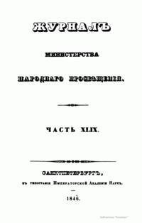 Журнал Министерства народного просвещения выходил с 1834-го по 1917 год. Официальный периодический журнал об успехах просвещения в России. Издатели журнала уверены в том, что «если для каждого человека необходим выход из грубой тьмы невежества и беспрерывное дальнейшее движение к свету, то для народов необходимо попечительное участие правительства в образовании. Только правительство имеет все средства знать и высоту успехов всемирного образования, и настоящие нужды Отечества».
