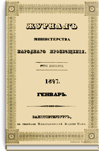 Журнал Министерства народного просвещения выходил с 1834-го по 1917 год. Официальный периодический журнал об успехах просвещения в России. Издатели журнала уверены в том, что «если для каждого человека необходим выход из грубой тьмы невежества и беспрерывное дальнейшее движение к свету, то для народов необходимо попечительное участие правительства в образовании. Только правительство имеет все средства знать и высоту успехов всемирного образования, и настоящие нужды Отечества».