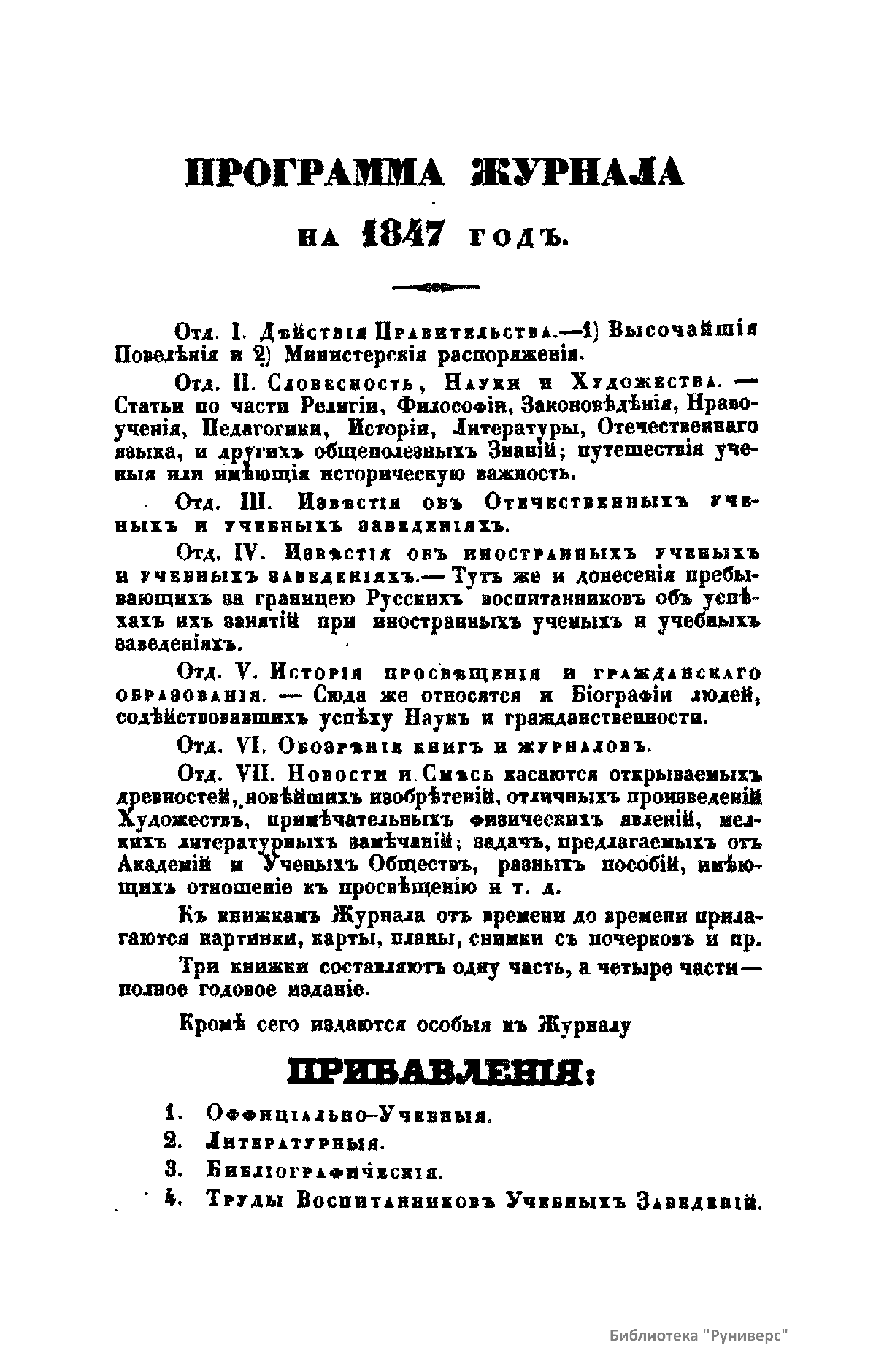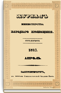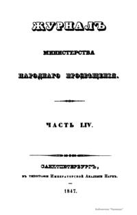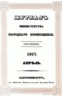 Журнал Министерства народного просвещения выходил с 1834-го по 1917 год. Официальный периодический журнал об успехах просвещения в России. Издатели журнала уверены в том, что «если для каждого человека необходим выход из грубой тьмы невежества и беспрерывное дальнейшее движение к свету, то для народов необходимо попечительное участие правительства в образовании. Только правительство имеет все средства знать и высоту успехов всемирного образования, и настоящие нужды Отечества».