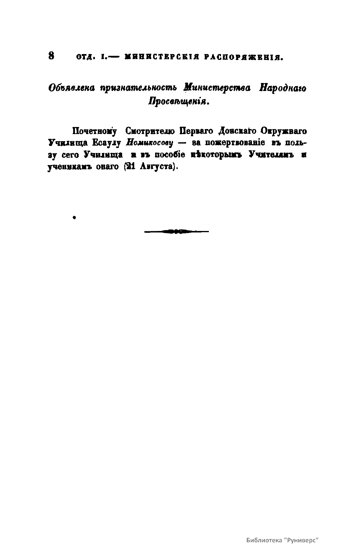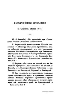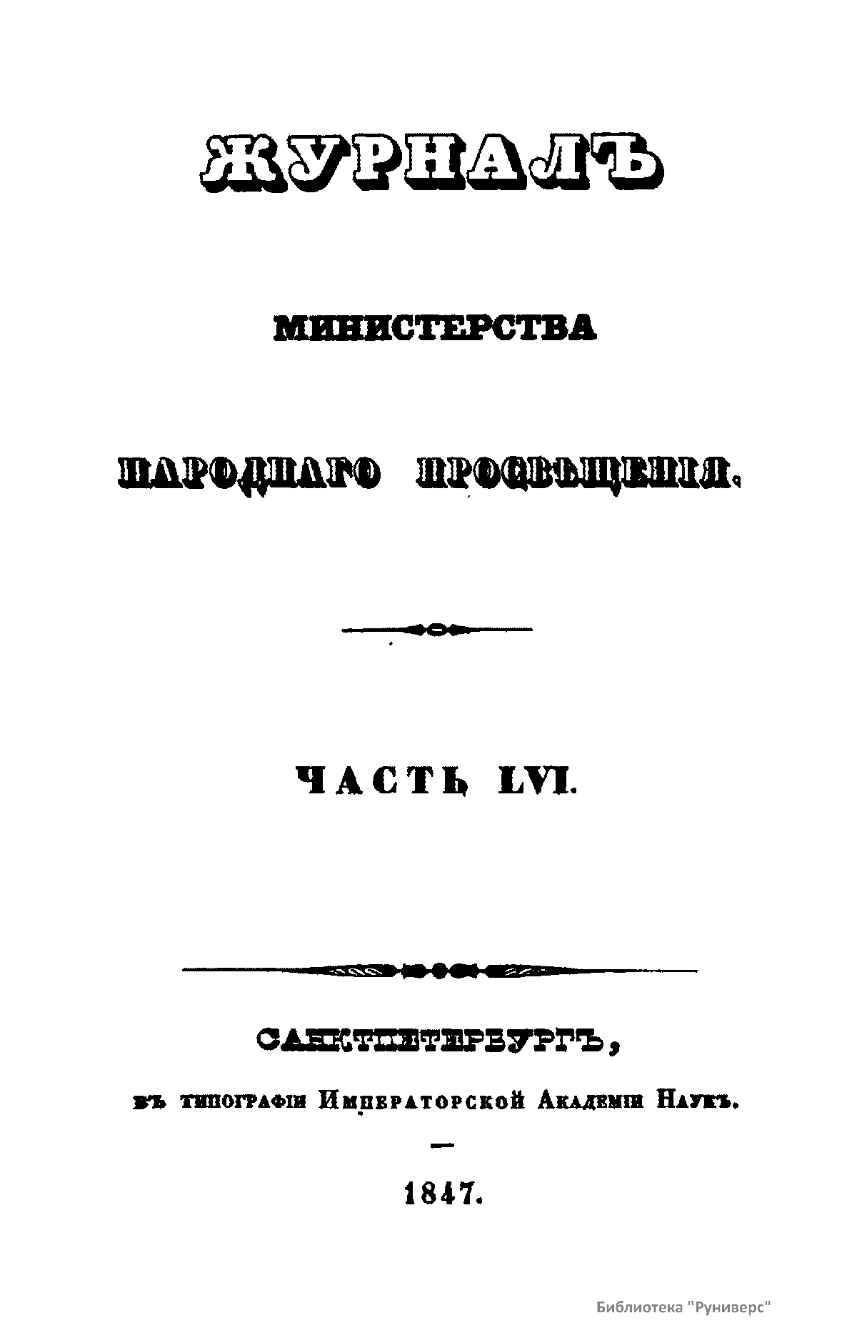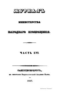Журнал Министерства народного просвещения выходил с 1834-го по 1917 год. Официальный периодический журнал об успехах просвещения в России. Издатели журнала уверены в том, что «если для каждого человека необходим выход из грубой тьмы невежества и беспрерывное дальнейшее движение к свету, то для народов необходимо попечительное участие правительства в образовании. Только правительство имеет все средства знать и высоту успехов всемирного образования, и настоящие нужды Отечества».