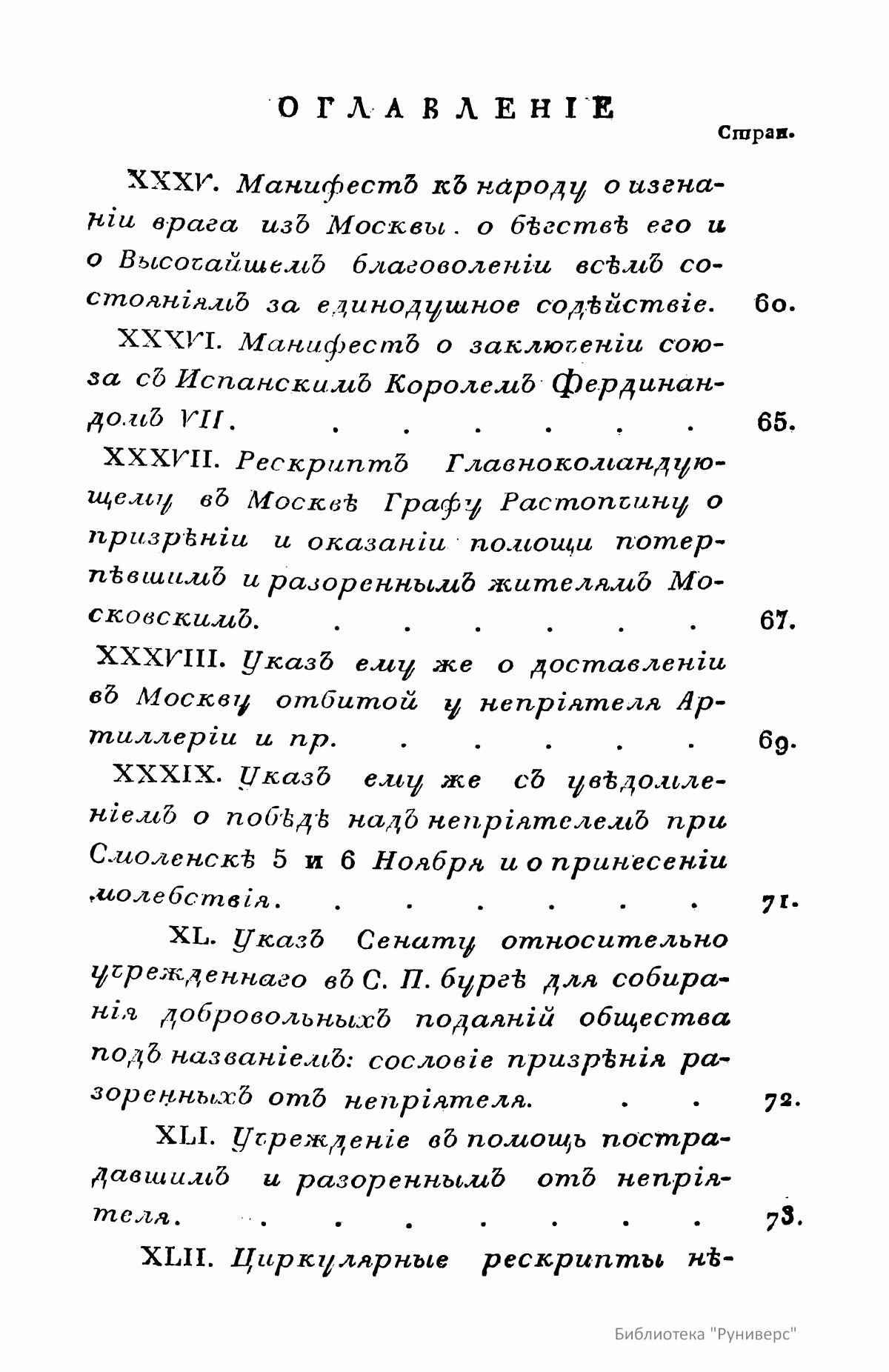 В книге опубликованы 95 высочайших манифестов, грамот, указов, рескриптов, приказов войскам и разных извещений за 1812, 1813, 1814, 1815 и 1816 годы. Перечень документов дан в начале издания. Издатели уверены в том, что данное собрание послужит для будущих историков «вернейшим источником истинных сведений и понятий» о совершившихся в эти годы «бессмертных подвигах и деяний». В этих документах «потомки увидят ясно и твердость правительства, и дух народа, и подвиги войск, протекших Европу с мужеством в сердце и правдой в устах».