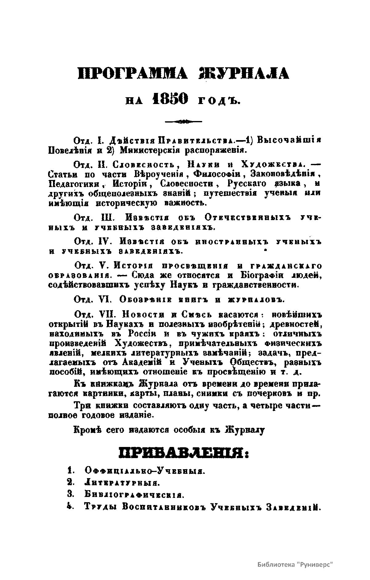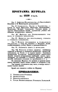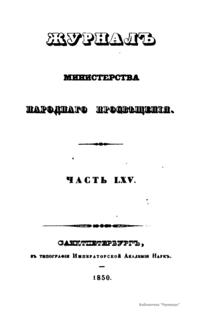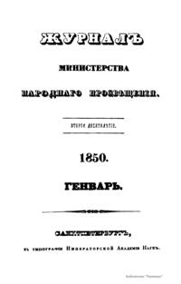 Журнал Министерства народного просвещения выходил с 1834-го по 1917 год. Официальный периодический журнал об успехах просвещения в России. Издатели журнала уверены в том, что «если для каждого человека необходим выход из грубой тьмы невежества и беспрерывное дальнейшее движение к свету, то для народов необходимо попечительное участие правительства в образовании. Только правительство имеет все средства знать и высоту успехов всемирного образования, и настоящие нужды Отечества».