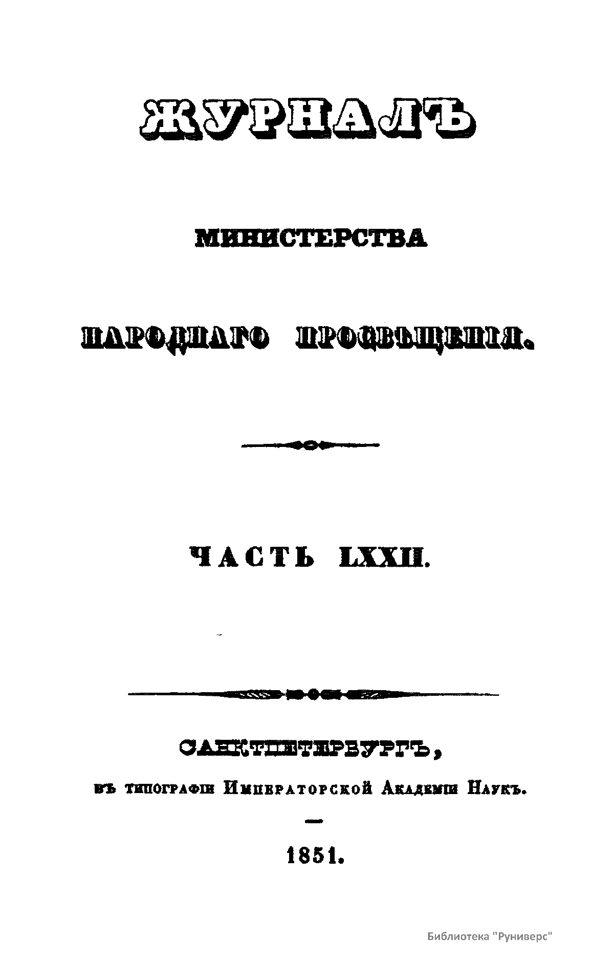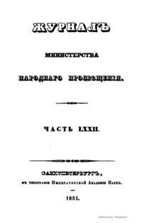 Журнал Министерства народного просвещения выходил с 1834-го по 1917 год. Официальный периодический журнал об успехах просвещения в России. Издатели журнала уверены в том, что «если для каждого человека необходим выход из грубой тьмы невежества и беспрерывное дальнейшее движение к свету, то для народов необходимо попечительное участие правительства в образовании. Только правительство имеет все средства знать и высоту успехов всемирного образования, и настоящие нужды Отечества».