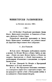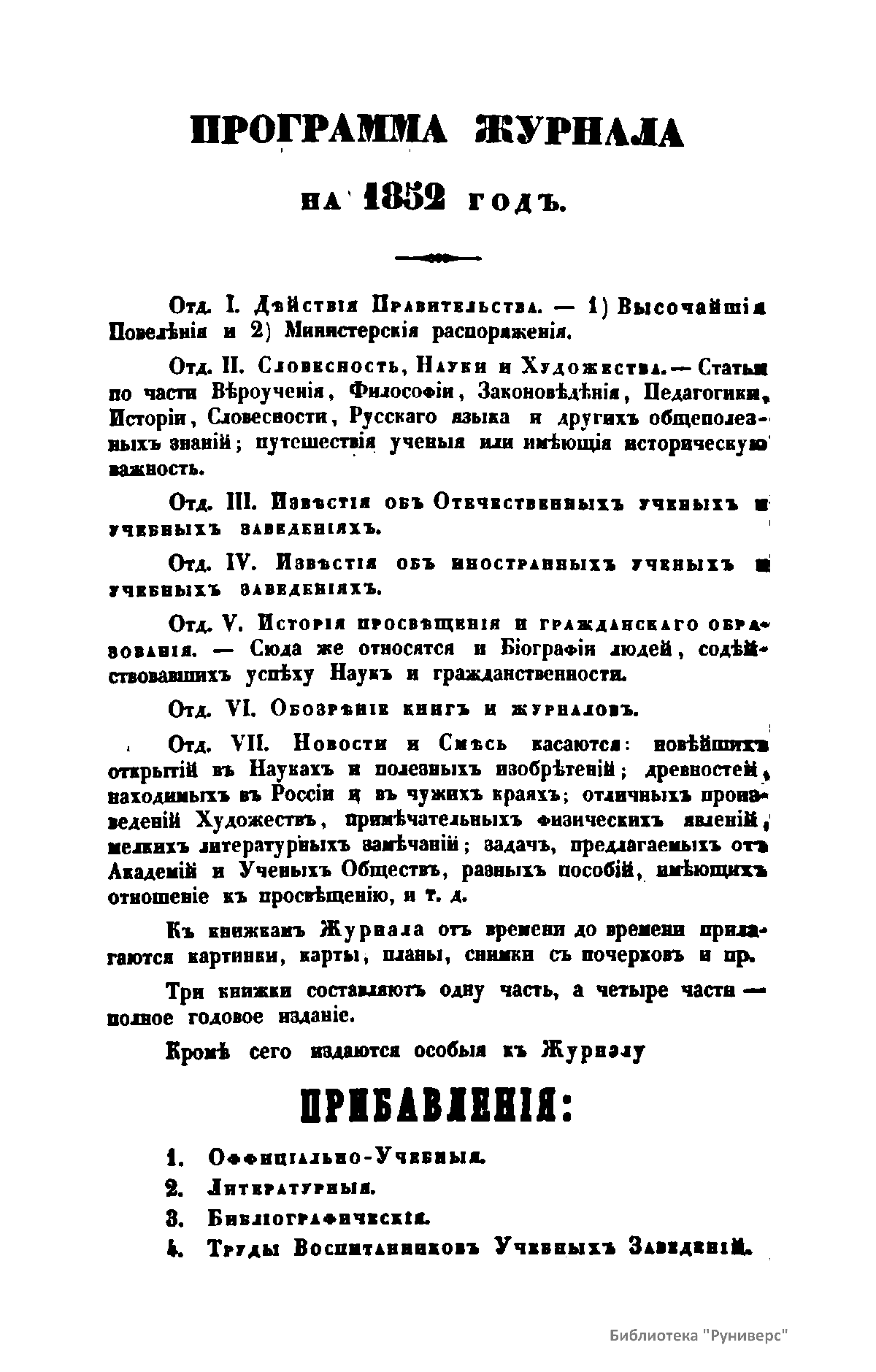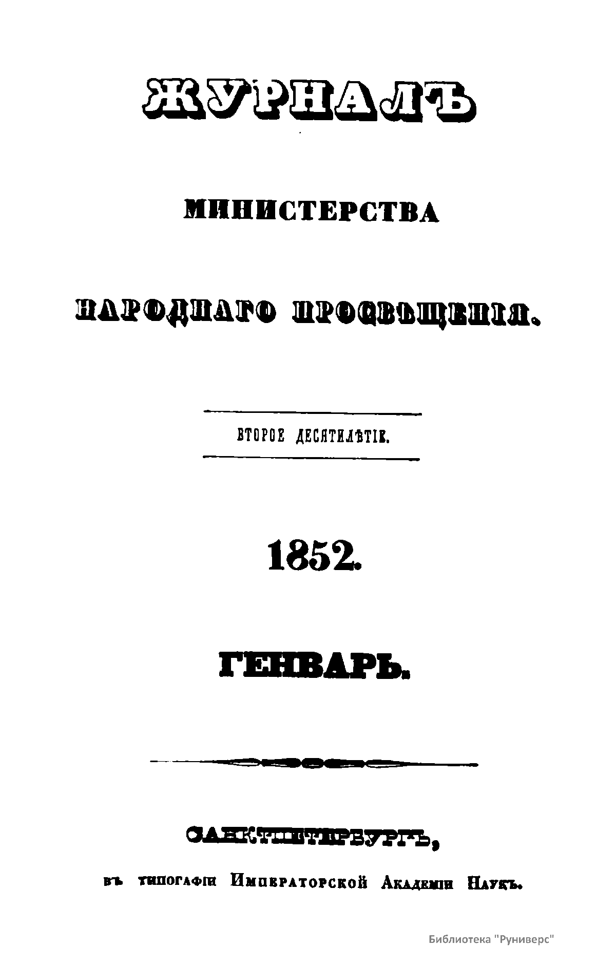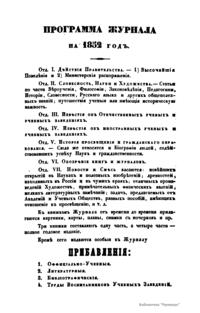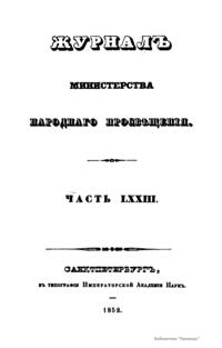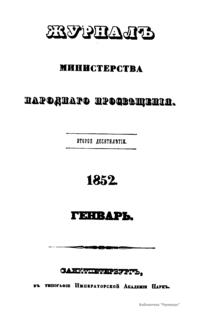 Журнал Министерства народного просвещения выходил с 1834-го по 1917 год. Официальный периодический журнал об успехах просвещения в России. Издатели журнала уверены в том, что «если для каждого человека необходим выход из грубой тьмы невежества и беспрерывное дальнейшее движение к свету, то для народов необходимо попечительное участие правительства в образовании. Только правительство имеет все средства знать и высоту успехов всемирного образования, и настоящие нужды Отечества».