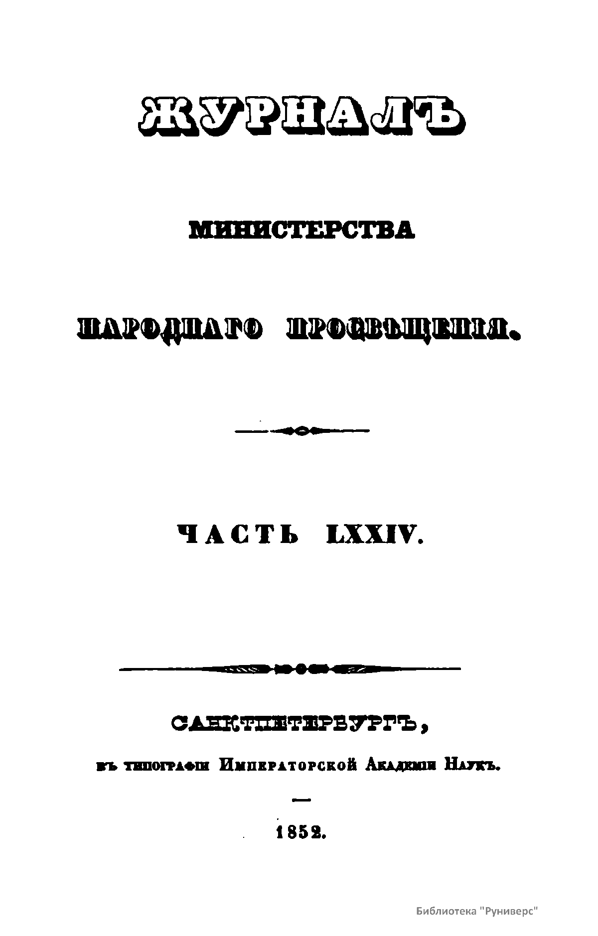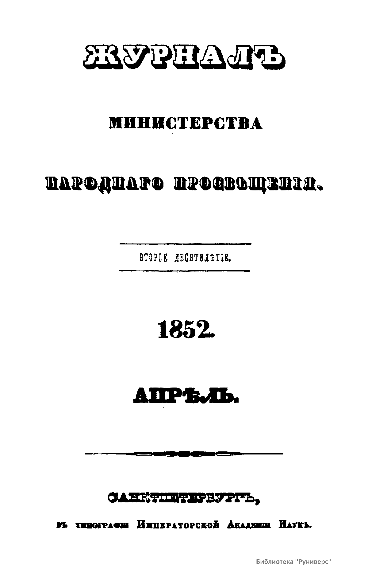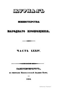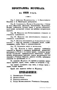 Журнал Министерства народного просвещения выходил с 1834-го по 1917 год. Официальный периодический журнал об успехах просвещения в России. Издатели журнала уверены в том, что «если для каждого человека необходим выход из грубой тьмы невежества и беспрерывное дальнейшее движение к свету, то для народов необходимо попечительное участие правительства в образовании. Только правительство имеет все средства знать и высоту успехов всемирного образования, и настоящие нужды Отечества».