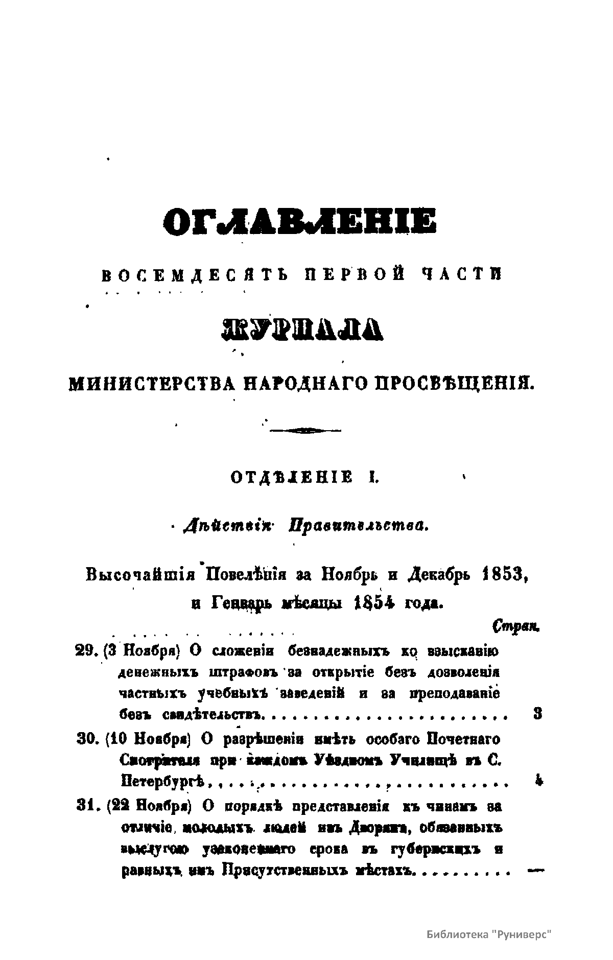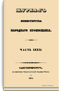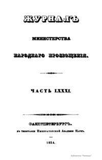 Журнал Министерства народного просвещения выходил с 1834-го по 1917 год. Официальный периодический журнал об успехах просвещения в России. Издатели журнала уверены в том, что «если для каждого человека необходим выход из грубой тьмы невежества и беспрерывное дальнейшее движение к свету, то для народов необходимо попечительное участие правительства в образовании. Только правительство имеет все средства знать и высоту успехов всемирного образования, и настоящие нужды Отечества».