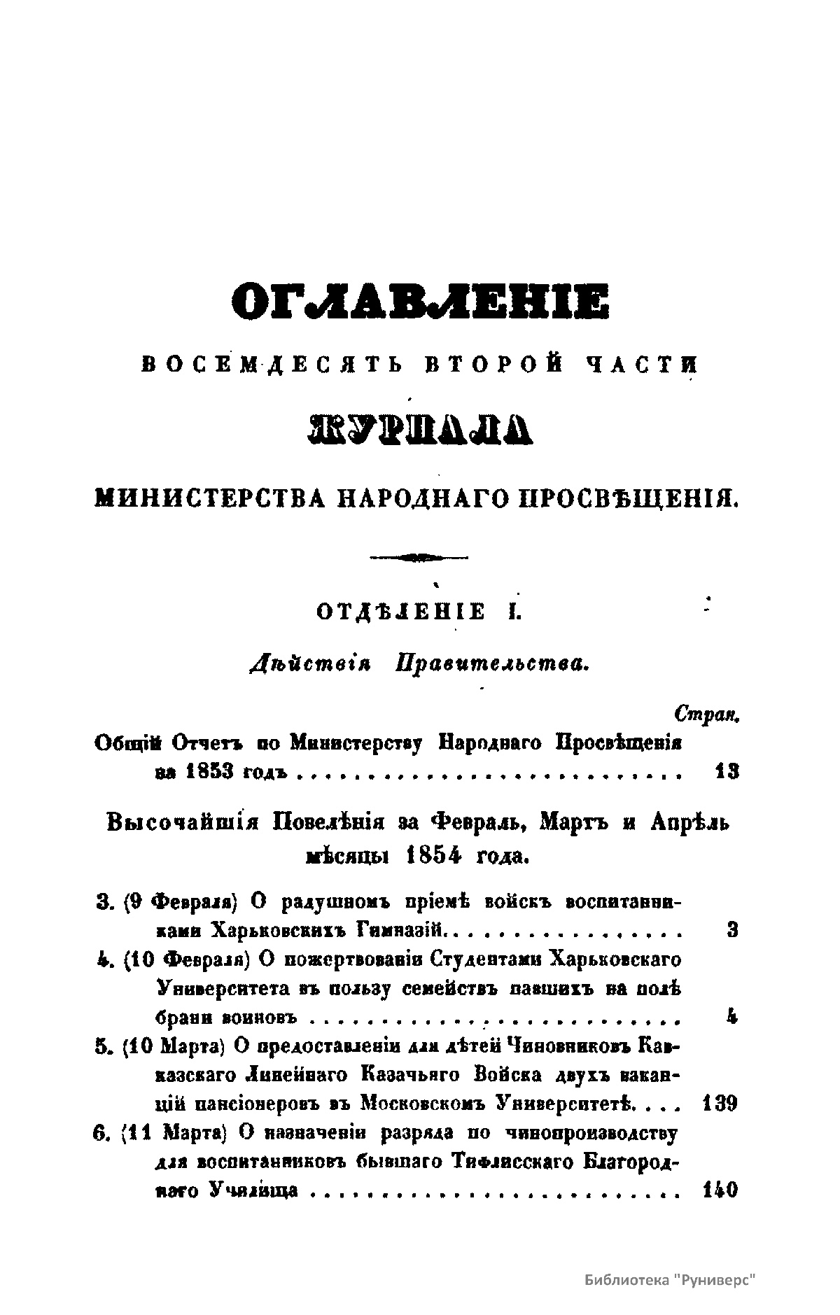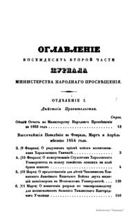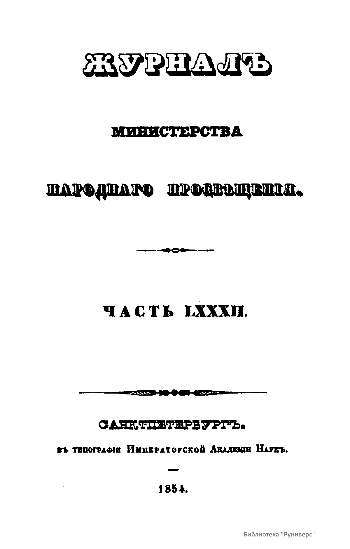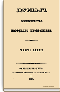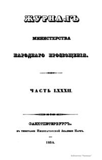 Журнал Министерства народного просвещения выходил с 1834-го по 1917 год. Официальный периодический журнал об успехах просвещения в России. Издатели журнала уверены в том, что «если для каждого человека необходим выход из грубой тьмы невежества и беспрерывное дальнейшее движение к свету, то для народов необходимо попечительное участие правительства в образовании. Только правительство имеет все средства знать и высоту успехов всемирного образования, и настоящие нужды Отечества».