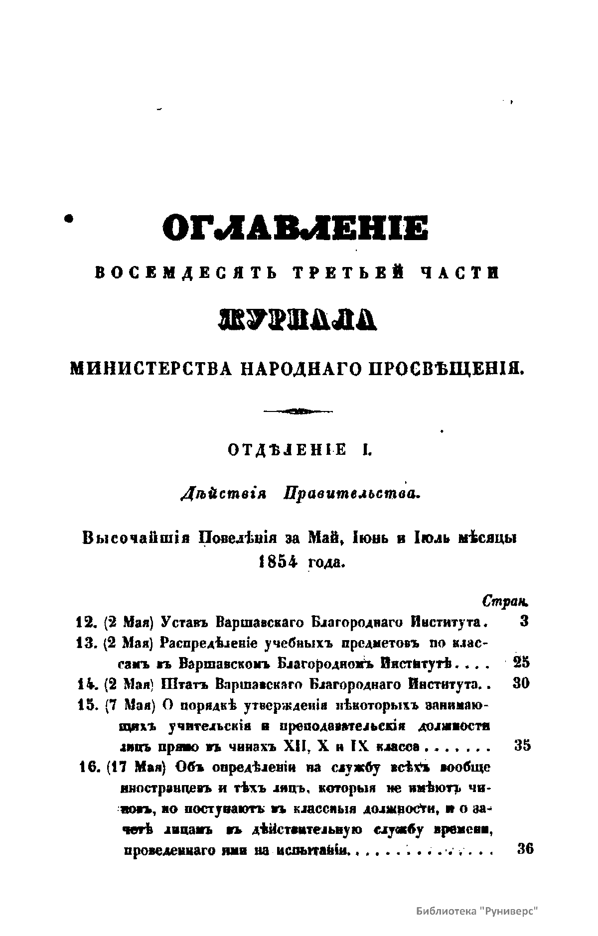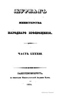 Журнал Министерства народного просвещения выходил с 1834-го по 1917 год. Официальный периодический журнал об успехах просвещения в России. Издатели журнала уверены в том, что «если для каждого человека необходим выход из грубой тьмы невежества и беспрерывное дальнейшее движение к свету, то для народов необходимо попечительное участие правительства в образовании. Только правительство имеет все средства знать и высоту успехов всемирного образования, и настоящие нужды Отечества».