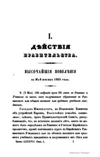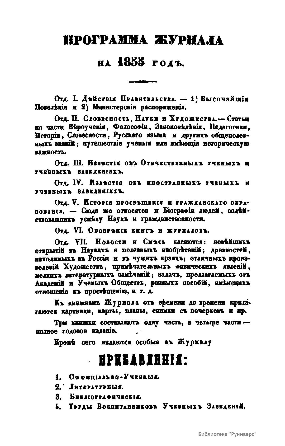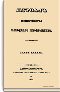 Журнал Министерства народного просвещения выходил с 1834-го по 1917 год. Официальный периодический журнал об успехах просвещения в России. Издатели журнала уверены в том, что «если для каждого человека необходим выход из грубой тьмы невежества и беспрерывное дальнейшее движение к свету, то для народов необходимо попечительное участие правительства в образовании. Только правительство имеет все средства знать и высоту успехов всемирного образования, и настоящие нужды Отечества».